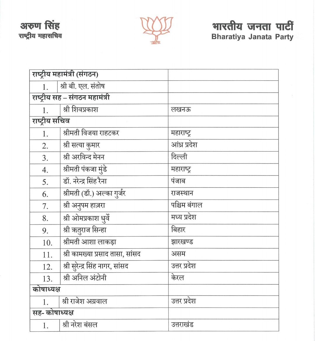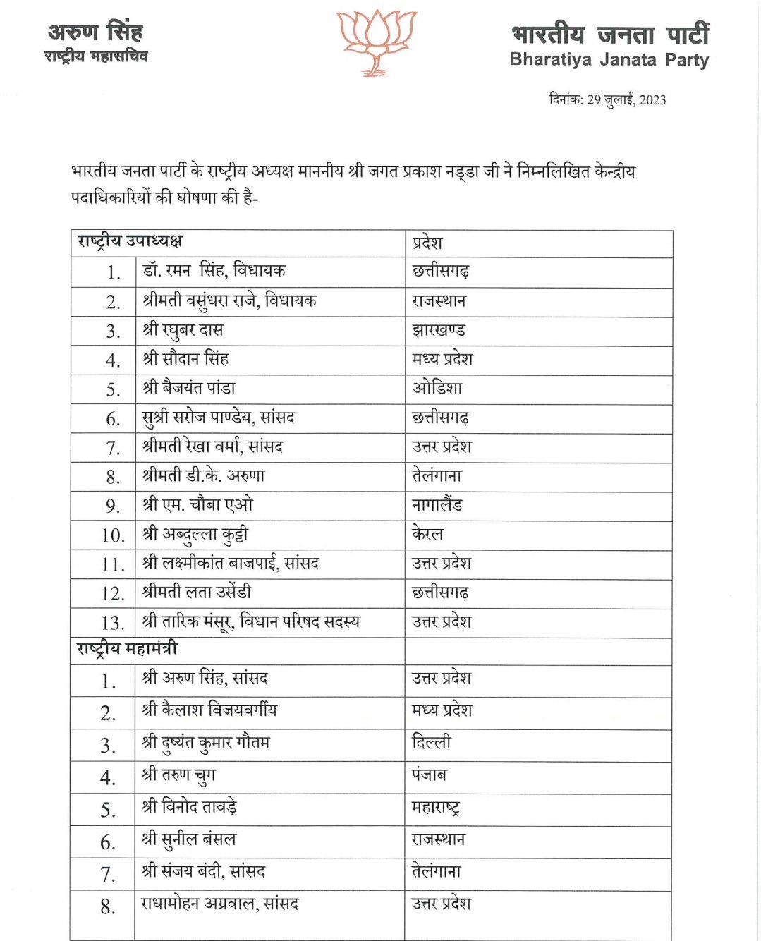 भाजपा की ओर से जारी सूची में राजस्थान की पूर्व मुख्यमंत्री वसुंधरा राजे, छत्तीसगढ़ के पूर्व सीएम डॉ. रमन सिंह, झारखंड के पूर्व मुख्यमंत्री रघुबर दास और सौदान सिंह को पार्टी का राष्ट्रीय उपाध्यक्ष नियुक्त किया गया है। इसके अलावा कैलाश विजयवर्गीय, अरुण सिंह और तरुण चुग को महामंत्री बनाया गया है। इसके साथ ही बीएल संतोष को राष्ट्रीय महामंत्री (संगठन), शिवप्रकाश (लखनऊ) को राष्ट्रीय सह-संगठन महामंत्री, राजेश अग्रवाल (उत्तर प्रदेश) को कोषाध्यक्ष और नरेश बंसल (उत्तराखंड) को सह-कोषाध्यक्ष नियुक्त किया गया है।