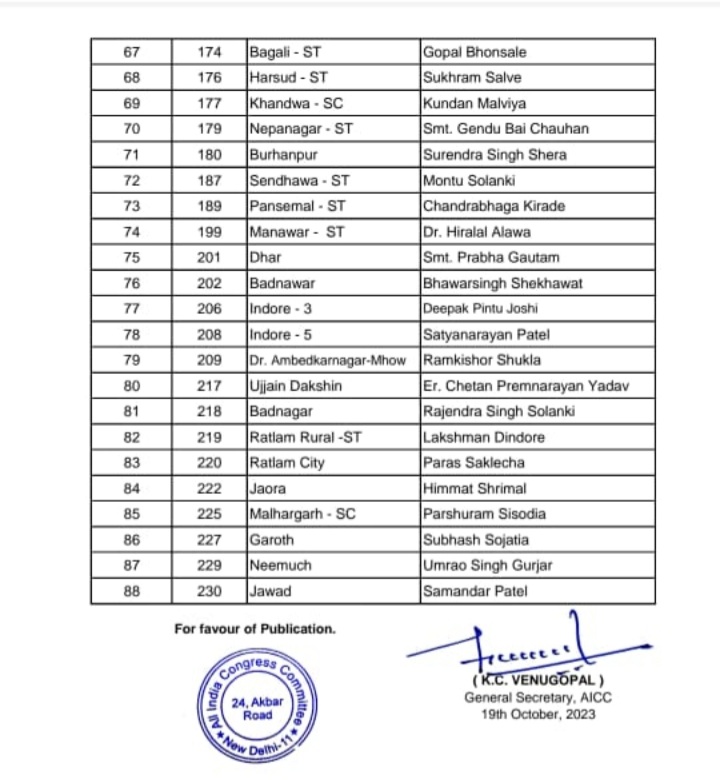 रतलाम,20अक्टूबर(खबरबाबा.काम)। कांग्रेस ने देर रात मध्य प्रदेश के शेष उम्मीदवारों की बहूप्रतिक्षित सूची जारी कर दी है। रतलाम शहर से एक बार फिर पारस सकलेचा को कांग्रेस ने अपना उम्मीदवार बनाया है। रतलाम ग्रामीण से लक्ष्मण डिंडोर और जावरा से चौंकाते हुए कांग्रेस ने हिम्मत सिंह श्रीमाल को उम्मीदवार बनाया है।