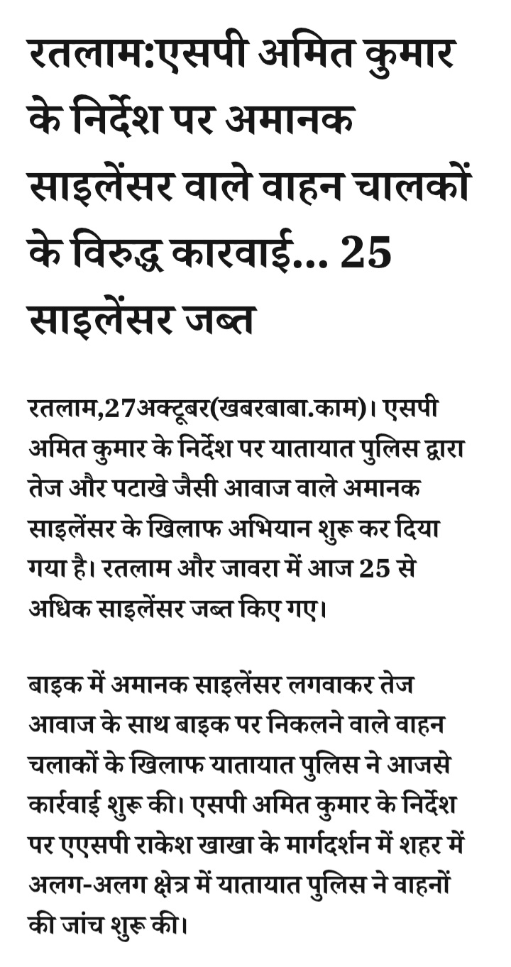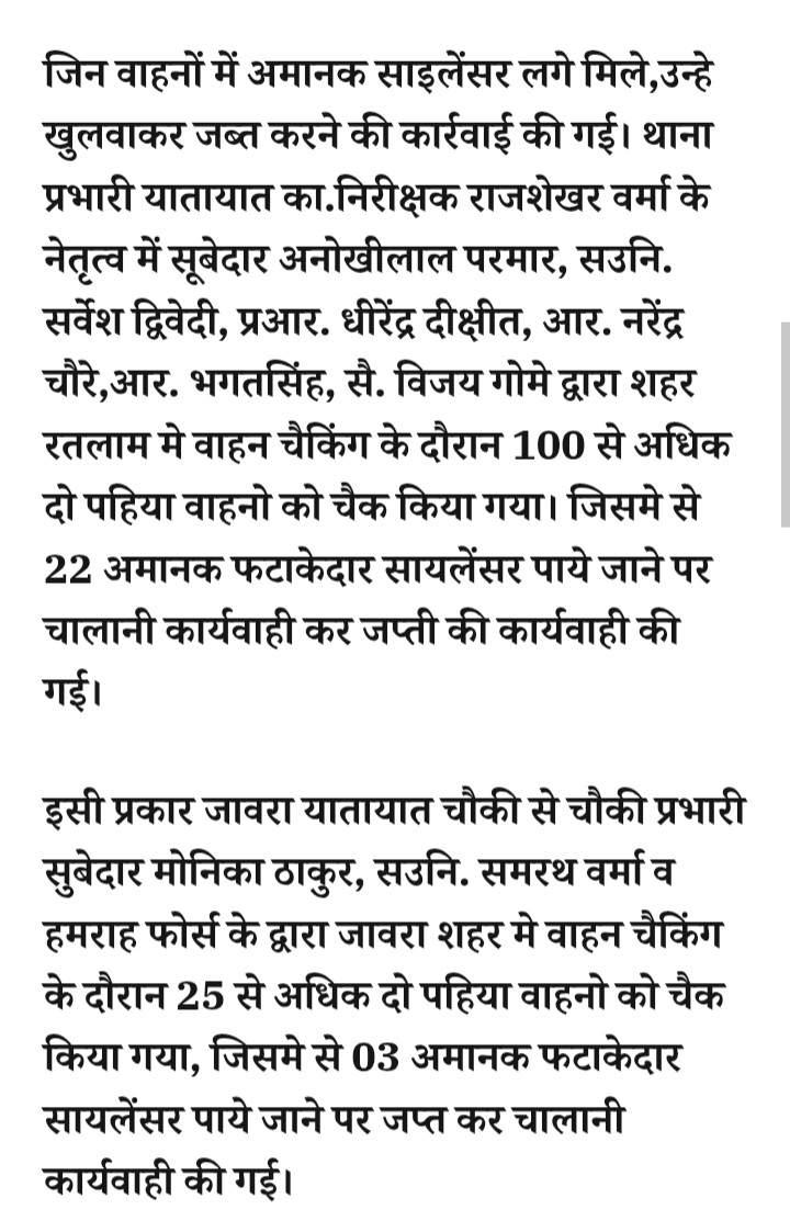 - रतलाम:एसपी अमित कुमार के निर्देश पर अमानक साइलेंसर वाले वाहन चालकों के विरुद्ध कारवाई… 25 साइलेंसर जब्त