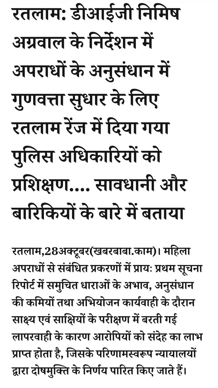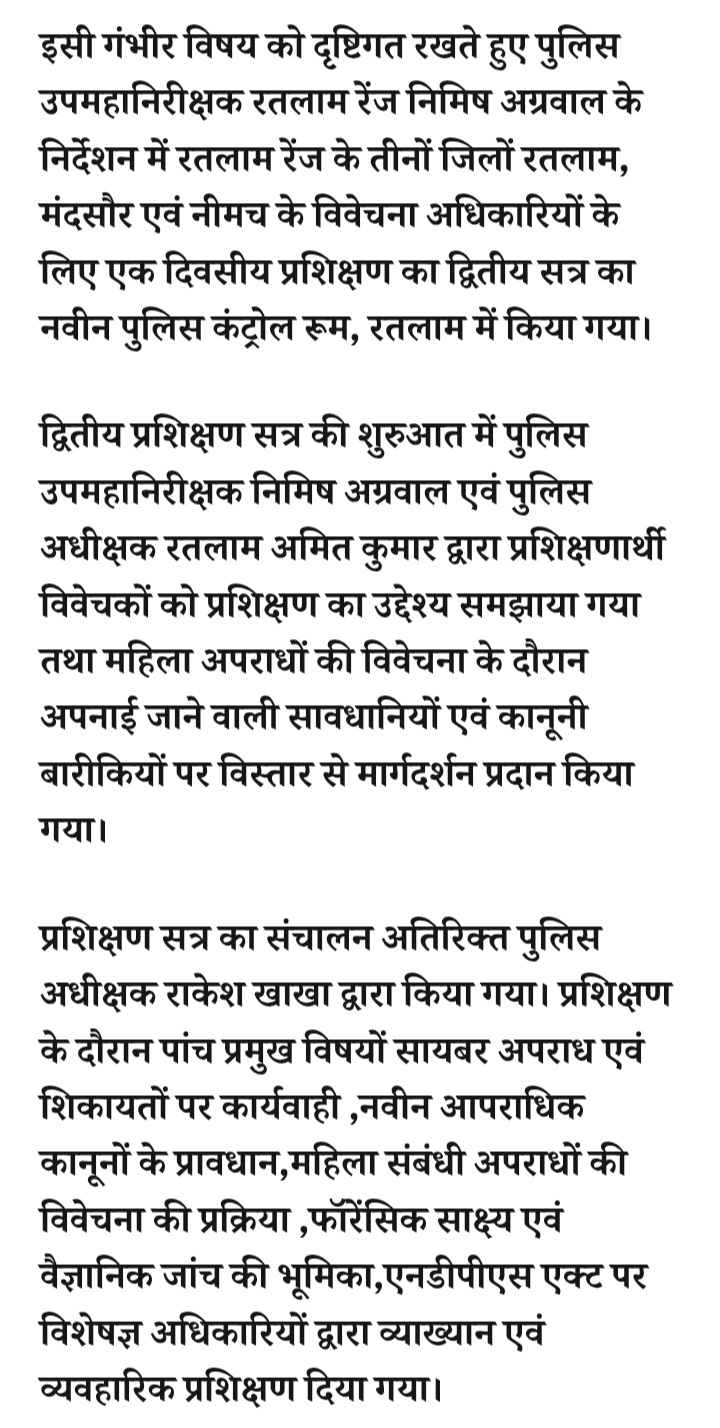 - रतलाम: डीआईजी निमिष अग्रवाल के निर्देशन में अपराधों के अनुसंधान में गुणवत्ता सुधार के लिए रतलाम रेंज में दिया गया पुलिस अधिकारियों को प्रशिक्षण…. सावधानी और बारिकियों के बारे में बताया