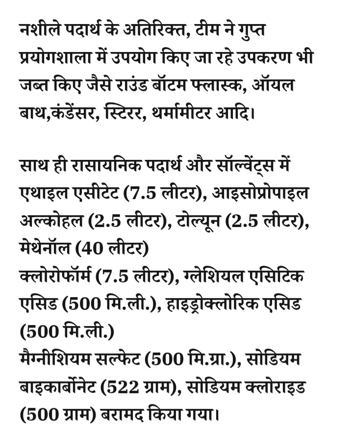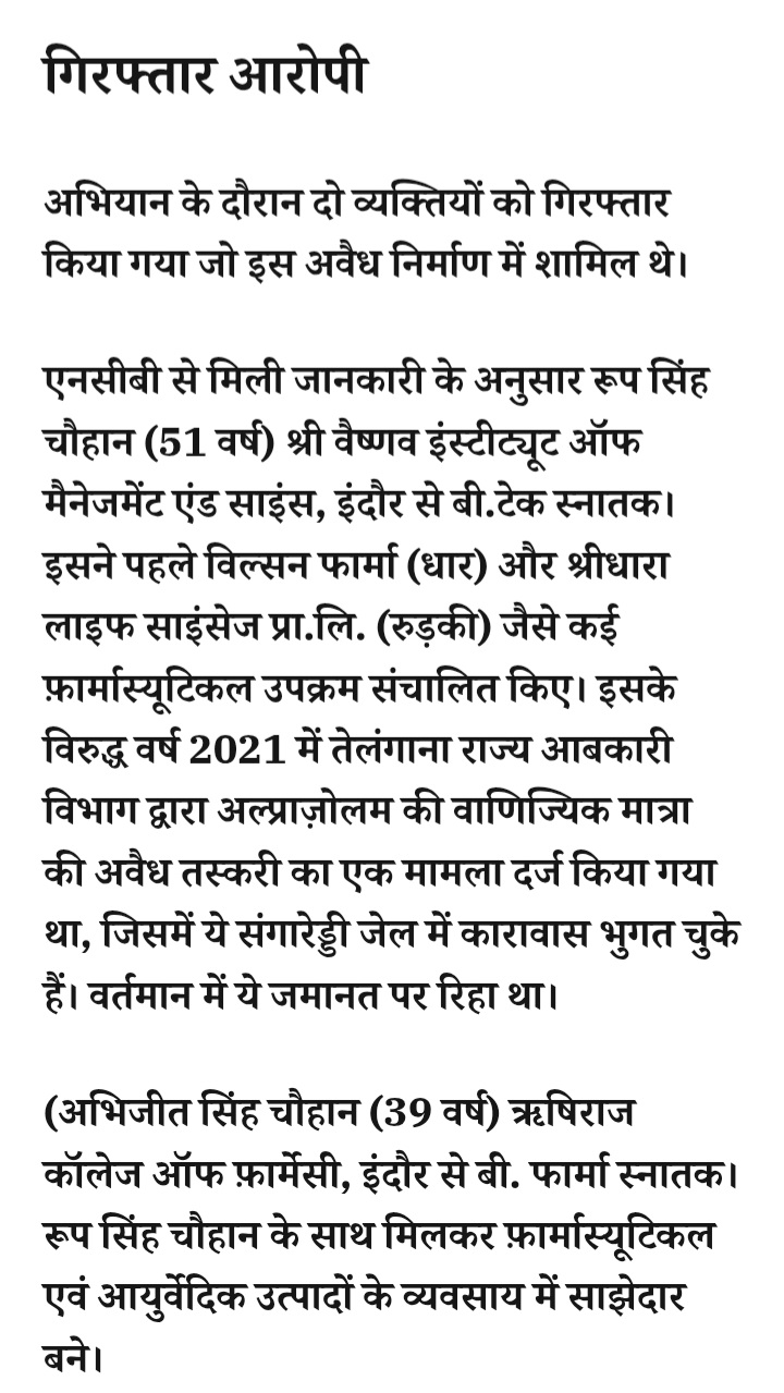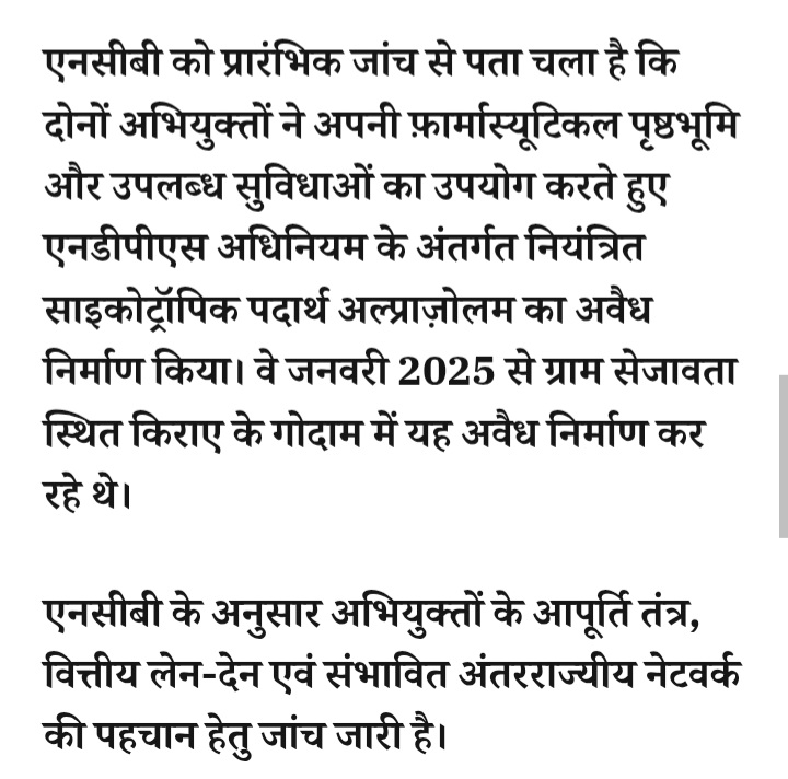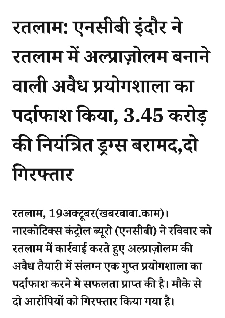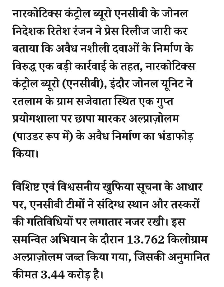 रतलाम: एनसीबी इंदौर ने रतलाम में अल्प्राज़ोलम बनाने वाली अवैध प्रयोगशाला का पर्दाफाश किया, 3.45 करोड़ की नियंत्रित ड्रग्स बरामद,दो गिरफ्तारOctober 19, 2025