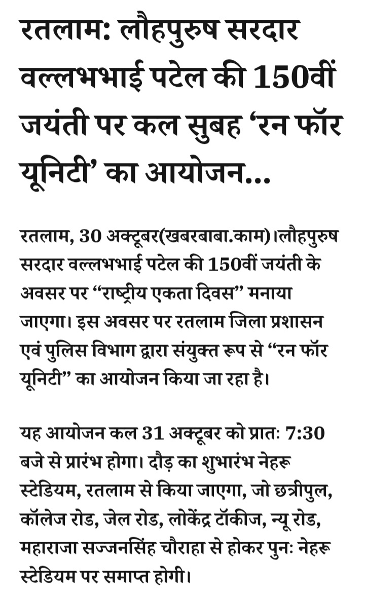- रतलाम: लौहपुरुष सरदार वल्लभभाई पटेल की 150वीं जयंती पर कल सुबह ‘रन फॉर यूनिटी’ का आयोजन…