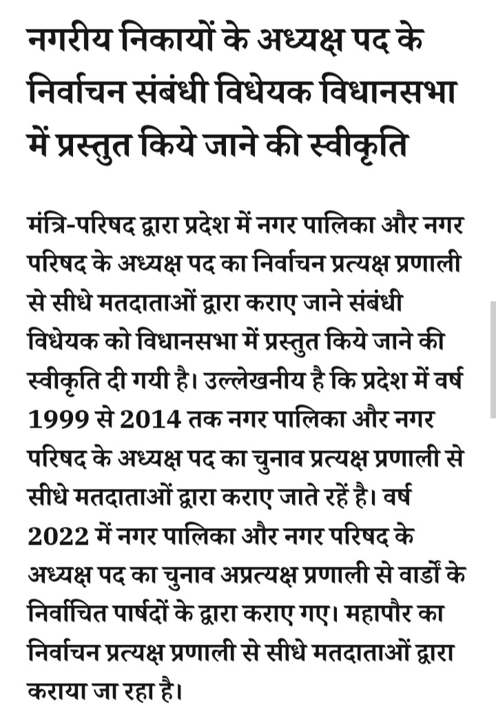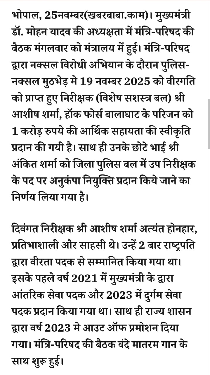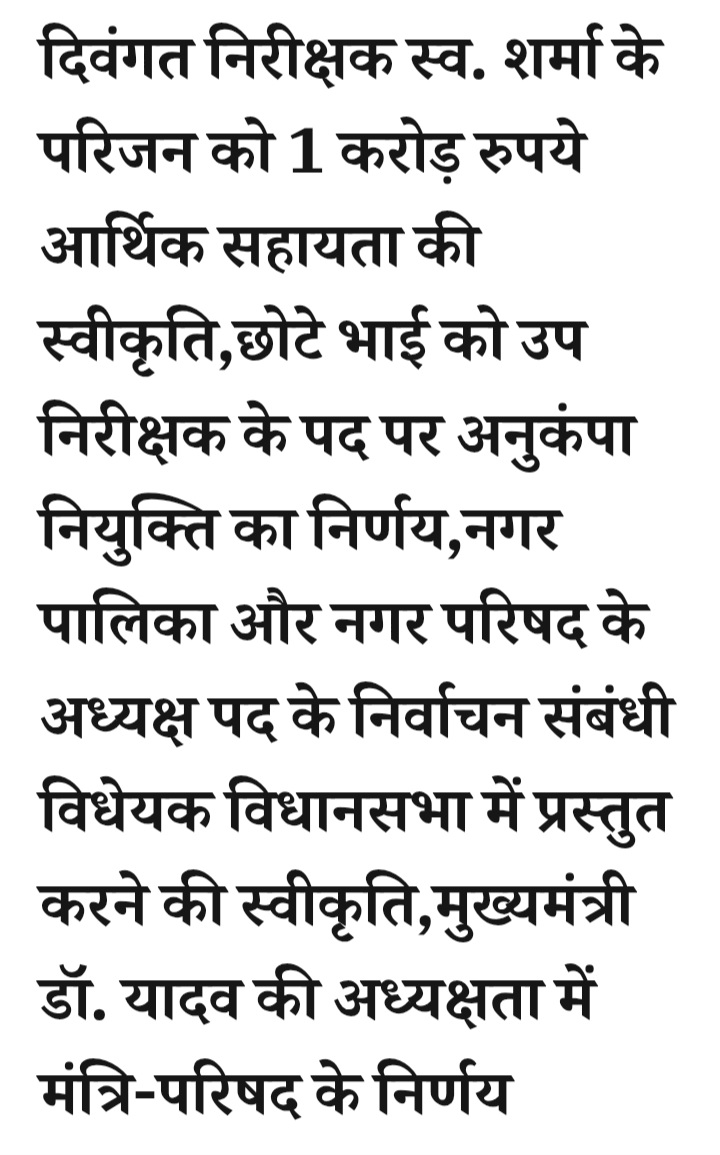 - दिवंगत निरीक्षक स्व. शर्मा के परिजन को 1 करोड़ रुपये आर्थिक सहायता की स्वीकृति,छोटे भाई को उप निरीक्षक के पद पर अनुकंपा नियुक्ति का निर्णय,नगर पालिका और नगर परिषद के अध्यक्ष पद के निर्वाचन संबंधी विधेयक विधानसभा में प्रस्तुत करने की स्वीकृति,मुख्यमंत्री डॉ. यादव की अध्यक्षता में मंत्रि-परिषद के निर्णय