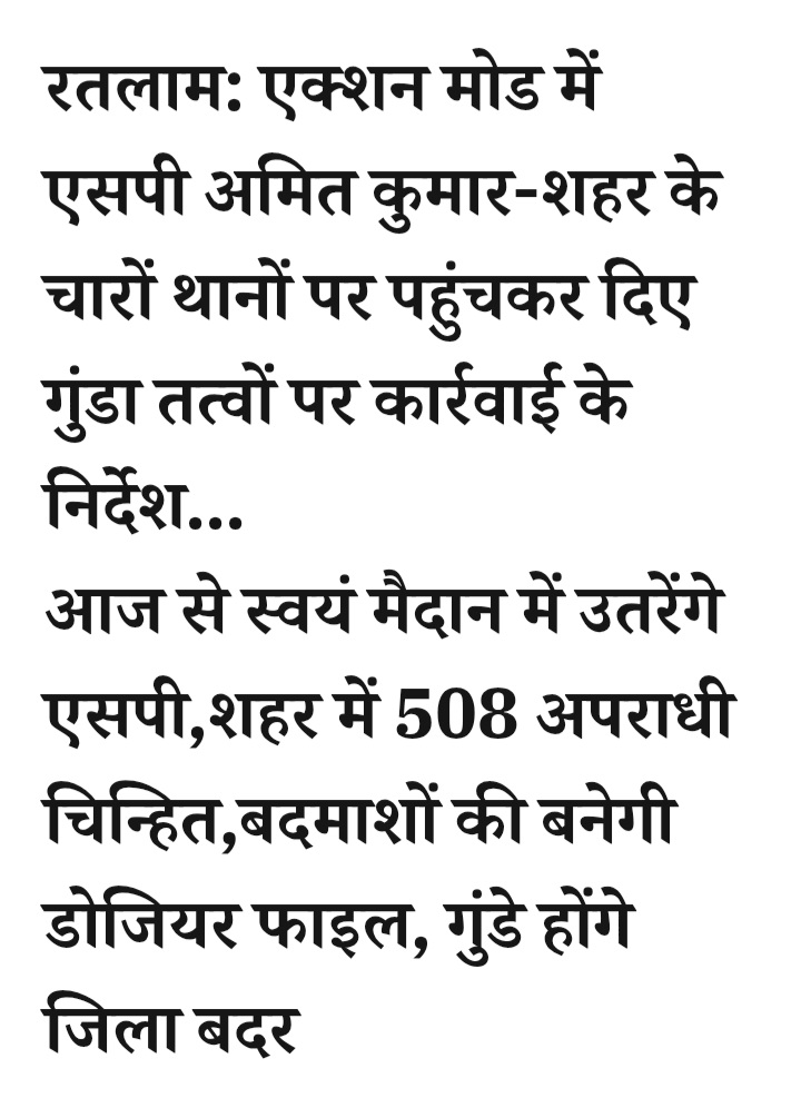 - रतलाम: एक्शन मोड में एसपी अमित कुमार-शहर के चारों थानों पर पहुंचकर दिए गुंडा तत्वों पर कार्रवाई के निर्देश… आज से स्वयं मैदान में उतरेंगे एसपी,शहर में 508 अपराधी चिन्हित,बदमाशों की बनेगी डोजियर फाइल, गुंडे होंगे जिला बदर