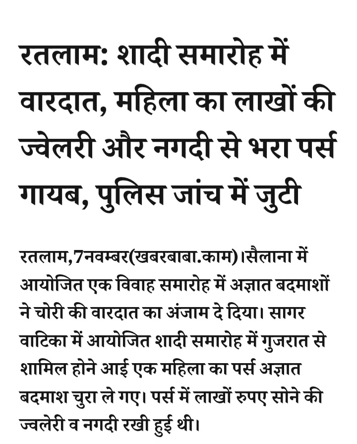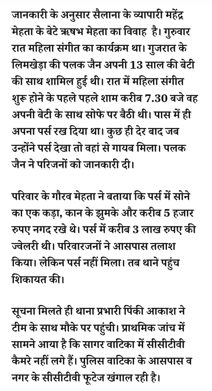 - रतलाम: शादी समारोह में वारदात, महिला का लाखों की ज्वेलरी और नगदी से भरा पर्स गायब, पुलिस जांच में जुटी
