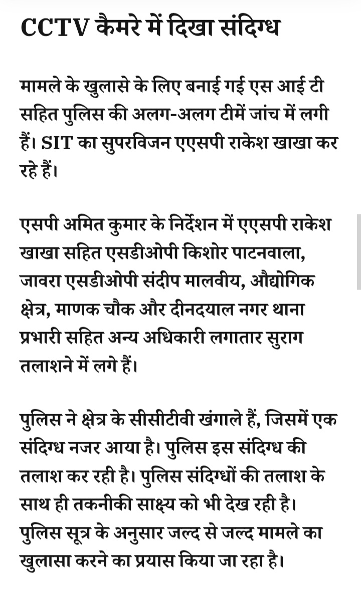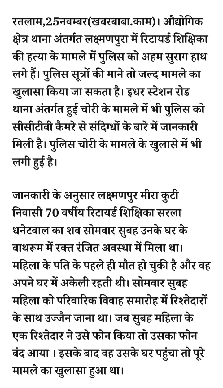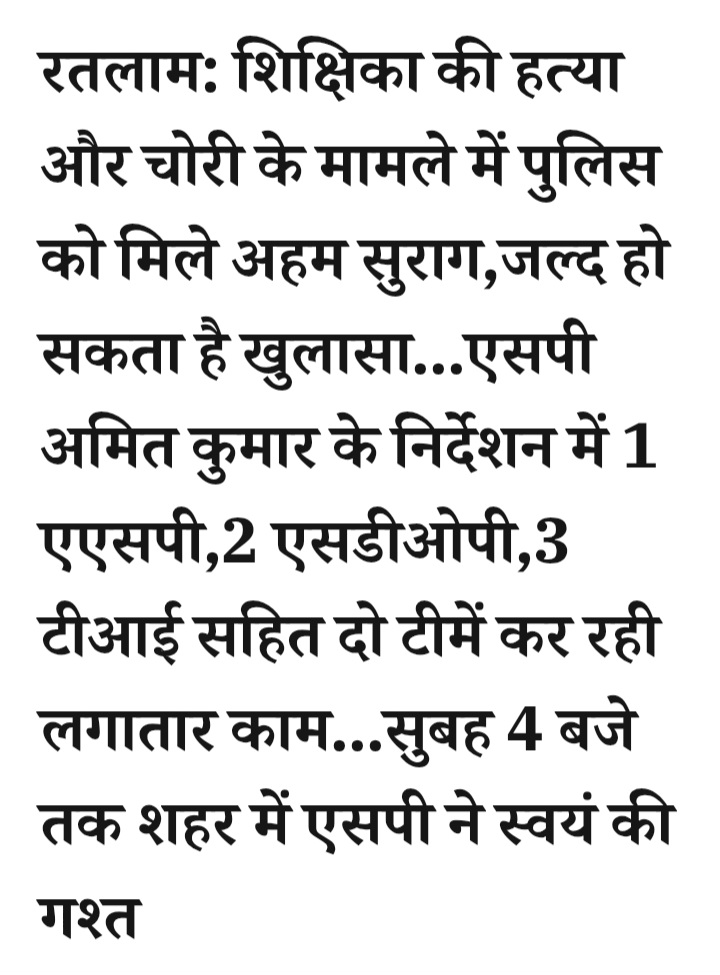रतलाम: शिक्षिका की हत्या और चोरी के मामले में पुलिस को मिले अहम सुराग,जल्द हो सकता है खुलासा…एसपी अमित कुमार के निर्देशन में 1 एएसपी,2 एसडीओपी,3 टीआई सहित दो टीमें कर रही लगातार काम…सुबह 4 बजे तक शहर में एसपी ने स्वयं की गश्तNovember 25, 2025