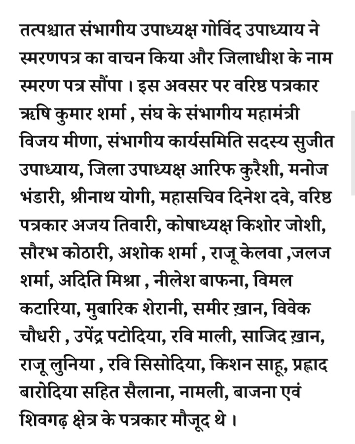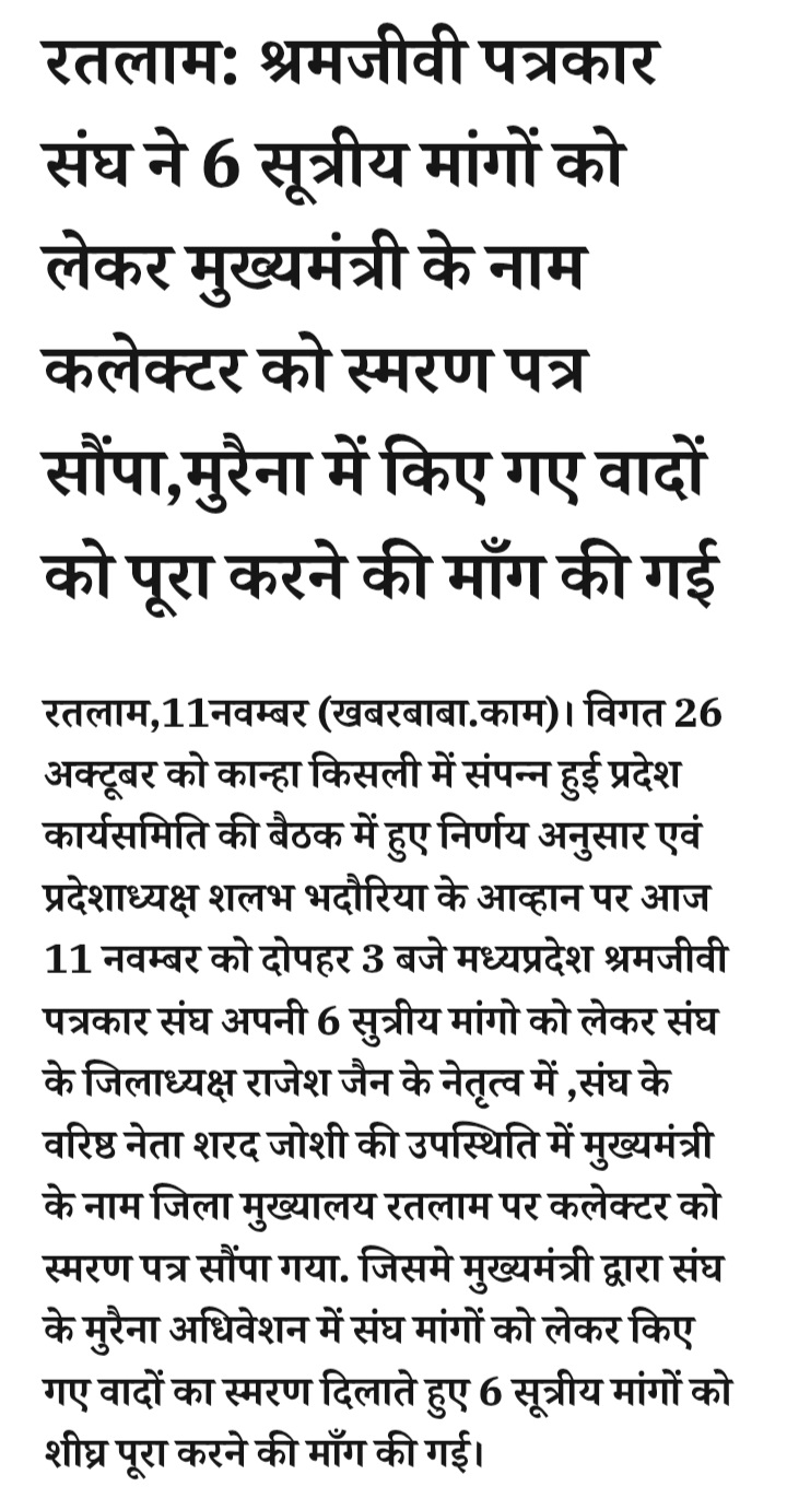 - रतलाम: श्रमजीवी पत्रकार संघ ने 6 सूत्रीय मांगों को लेकर मुख्यमंत्री के नाम कलेक्टर को स्मरण पत्र सौंपा,मुरैना में किए गए वादों को पूरा करने की माँग की गई