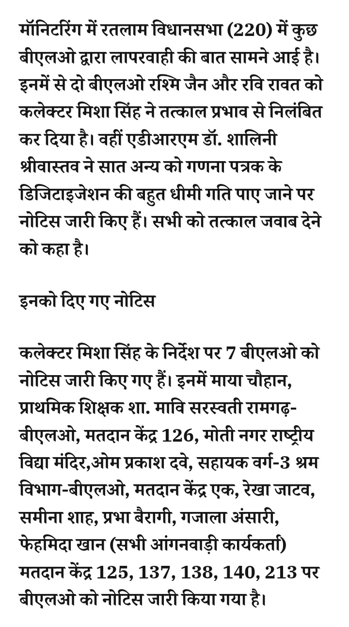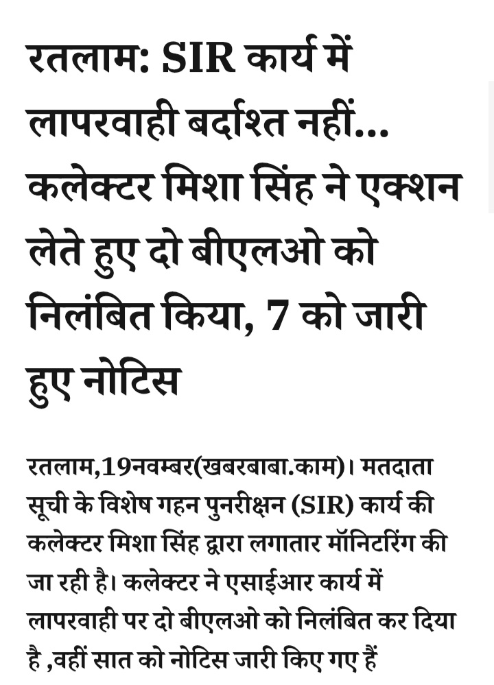 - रतलाम: SIR कार्य में लापरवाही बर्दाश्त नहीं… कलेक्टर मिशा सिंह ने एक्शन लेते हुए दो बीएलओ को निलंबित किया, 7 को जारी हुए नोटिस