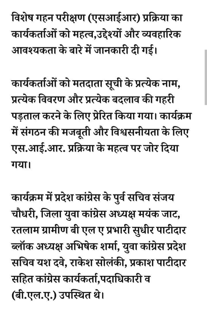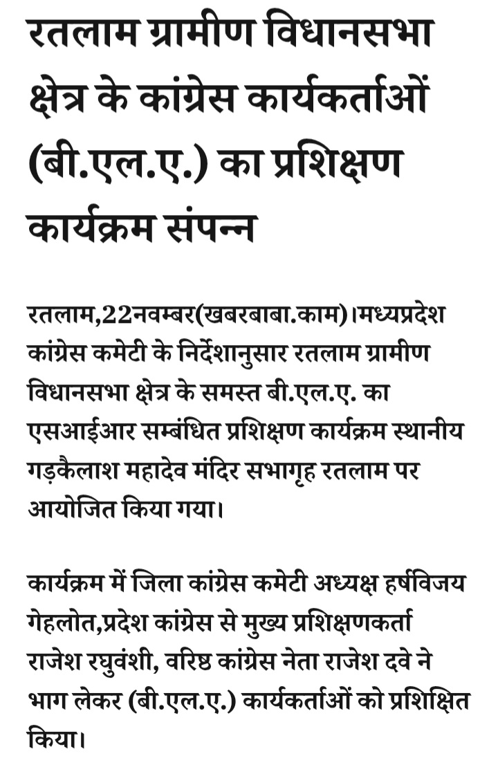 - रतलाम ग्रामीण विधानसभा क्षेत्र के कांग्रेस कार्यकर्ताओं (बी.एल.ए.) का प्रशिक्षण कार्यक्रम संपन्न