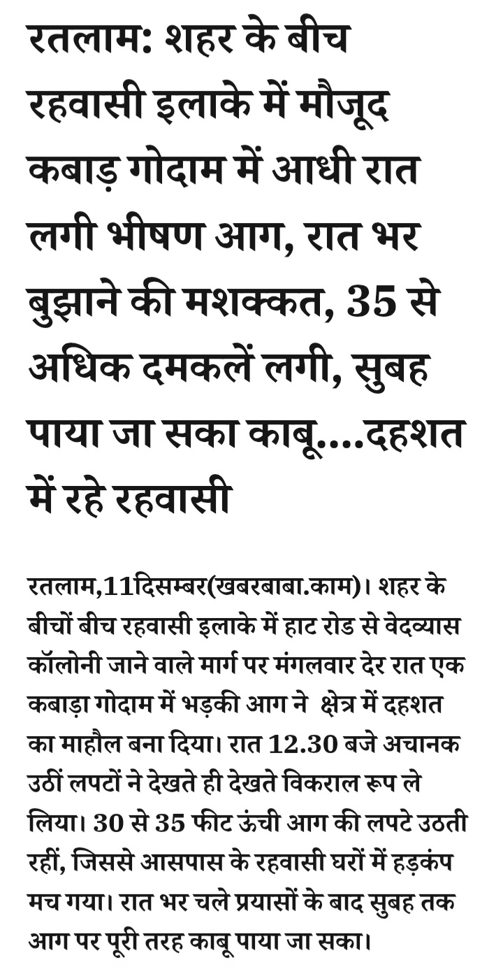 - रतलाम: शहर के बीच रहवासी इलाके में मौजूद कबाड़ गोदाम में आधी रात लगी भीषण आग, रात भर बुझाने की मशक्कत, 35 से अधिक दमकलें लगी, सुबह पाया जा सका काबू….दहशत में रहे रहवासी