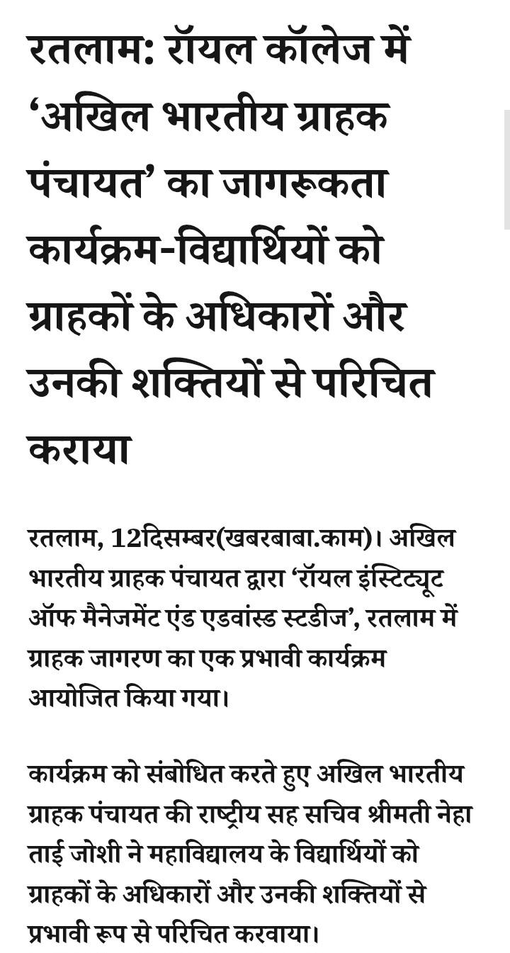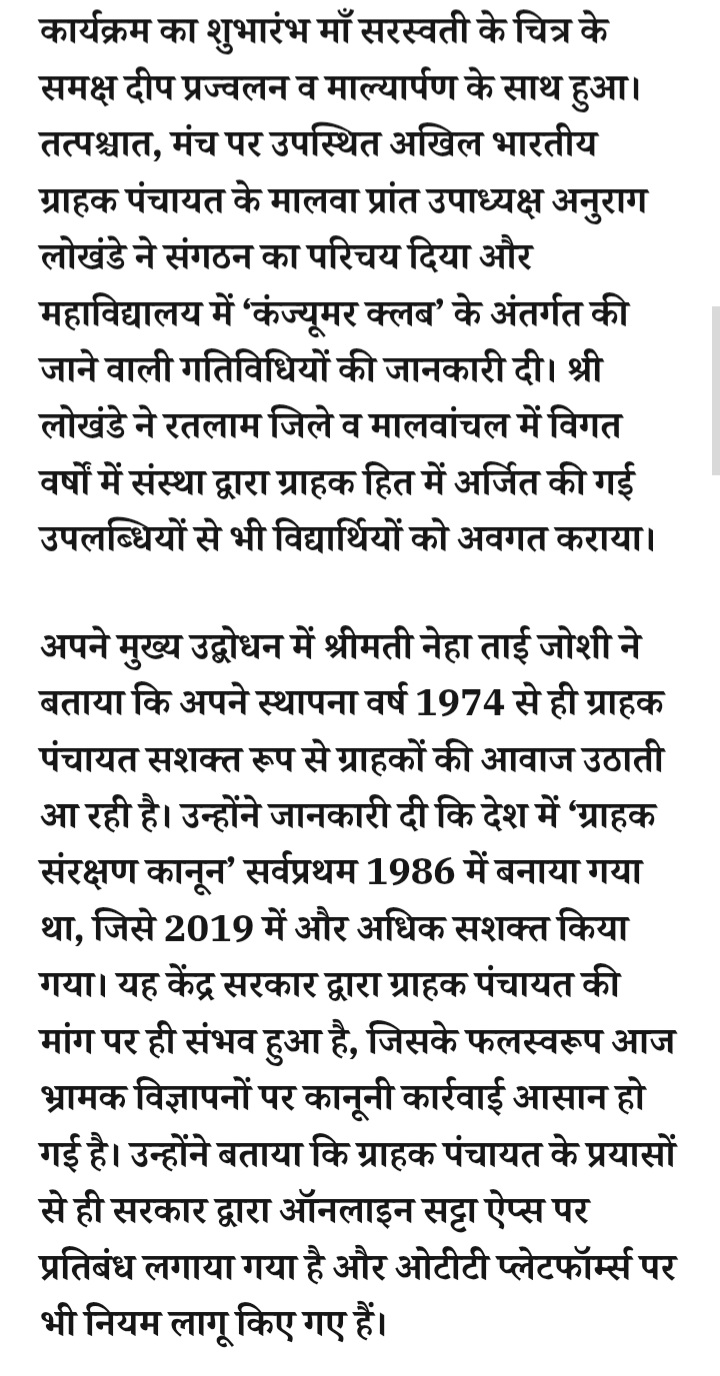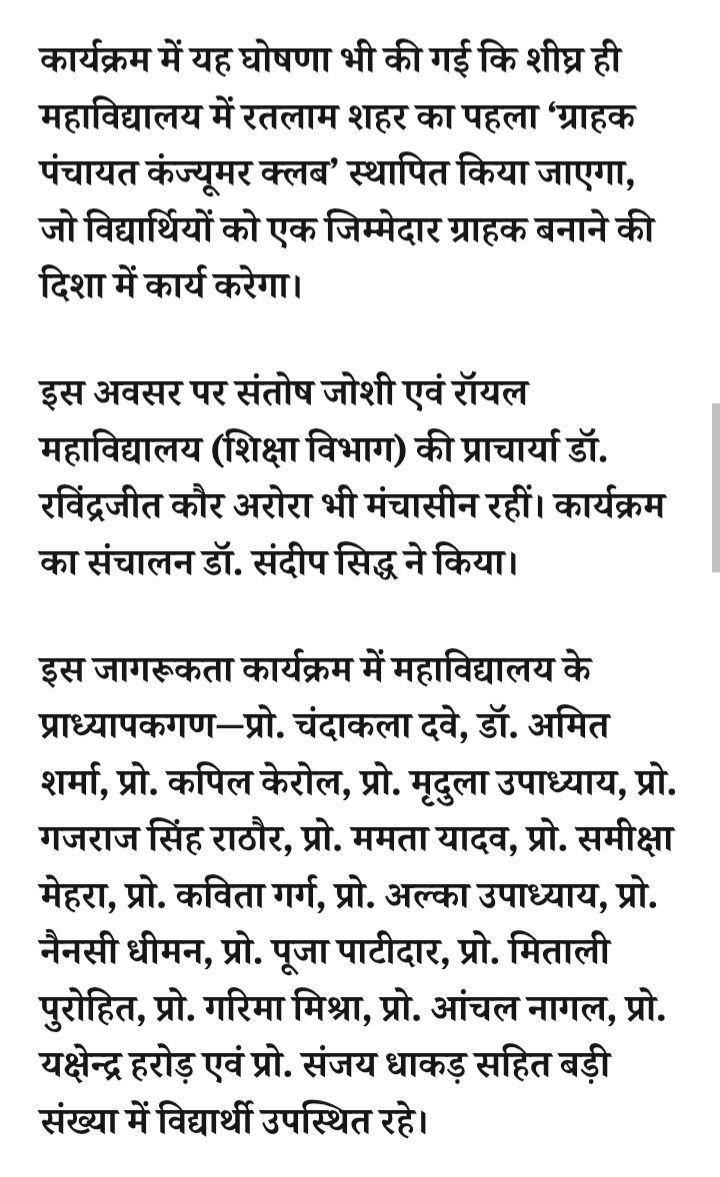 - रतलाम: रॉयल कॉलेज में ‘अखिल भारतीय ग्राहक पंचायत’ का जागरूकता कार्यक्रम-विद्यार्थियों को ग्राहकों के अधिकारों और उनकी शक्तियों से परिचित कराया