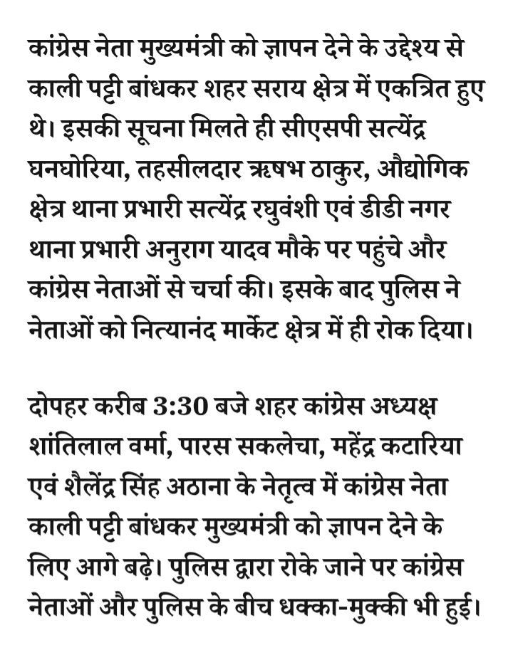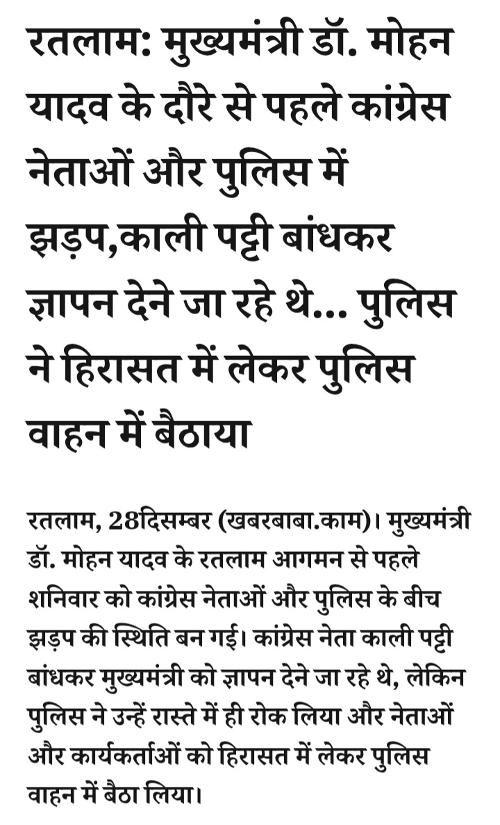 - रतलाम: मुख्यमंत्री डॉ. मोहन यादव के दौरे से पहले कांग्रेस नेताओं और पुलिस में झड़प,काली पट्टी बांधकर ज्ञापन देने जा रहे थे… पुलिस ने हिरासत में लेकर पुलिस वाहन में बैठाया