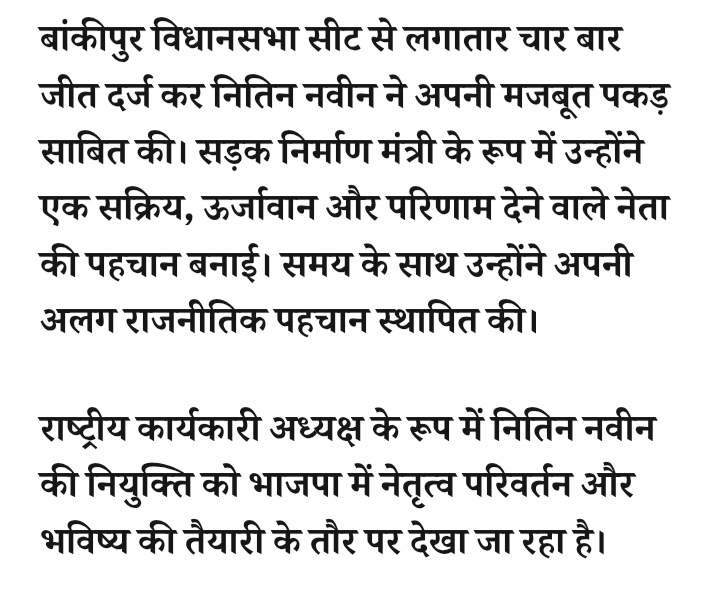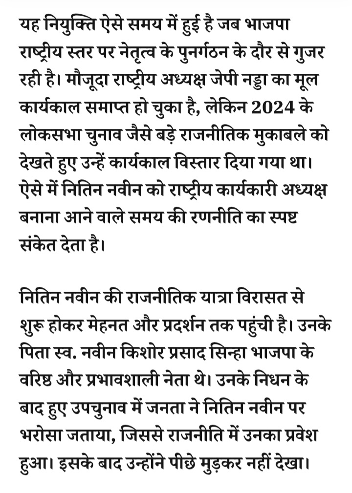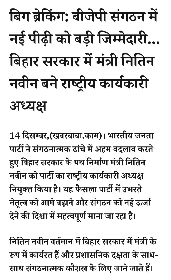 - बिग ब्रेकिंग: बीजेपी संगठन में नई पीढ़ी को बड़ी जिम्मेदारी… बिहार सरकार में मंत्री नितिन नवीन बने राष्ट्रीय कार्यकारी अध्यक्ष