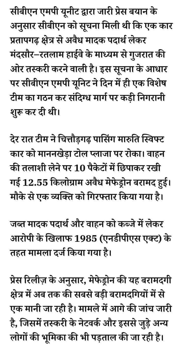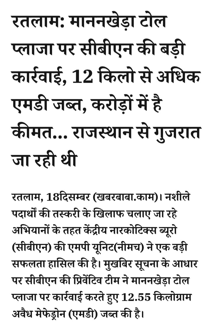 - रतलाम: माननखेड़ा टोल प्लाजा पर सीबीएन की बड़ी कार्रवाई, 12 किलो से अधिक एमडी जब्त, करोड़ों में है कीमत… राजस्थान से गुजरात जा रही थी