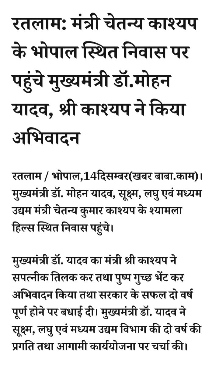 - रतलाम: मंत्री चेतन्य काश्यप के भोपाल स्थित निवास पर पहुंचे मुख्यमंत्री डॉ.मोहन यादव, श्री काश्यप ने किया अभिवादन