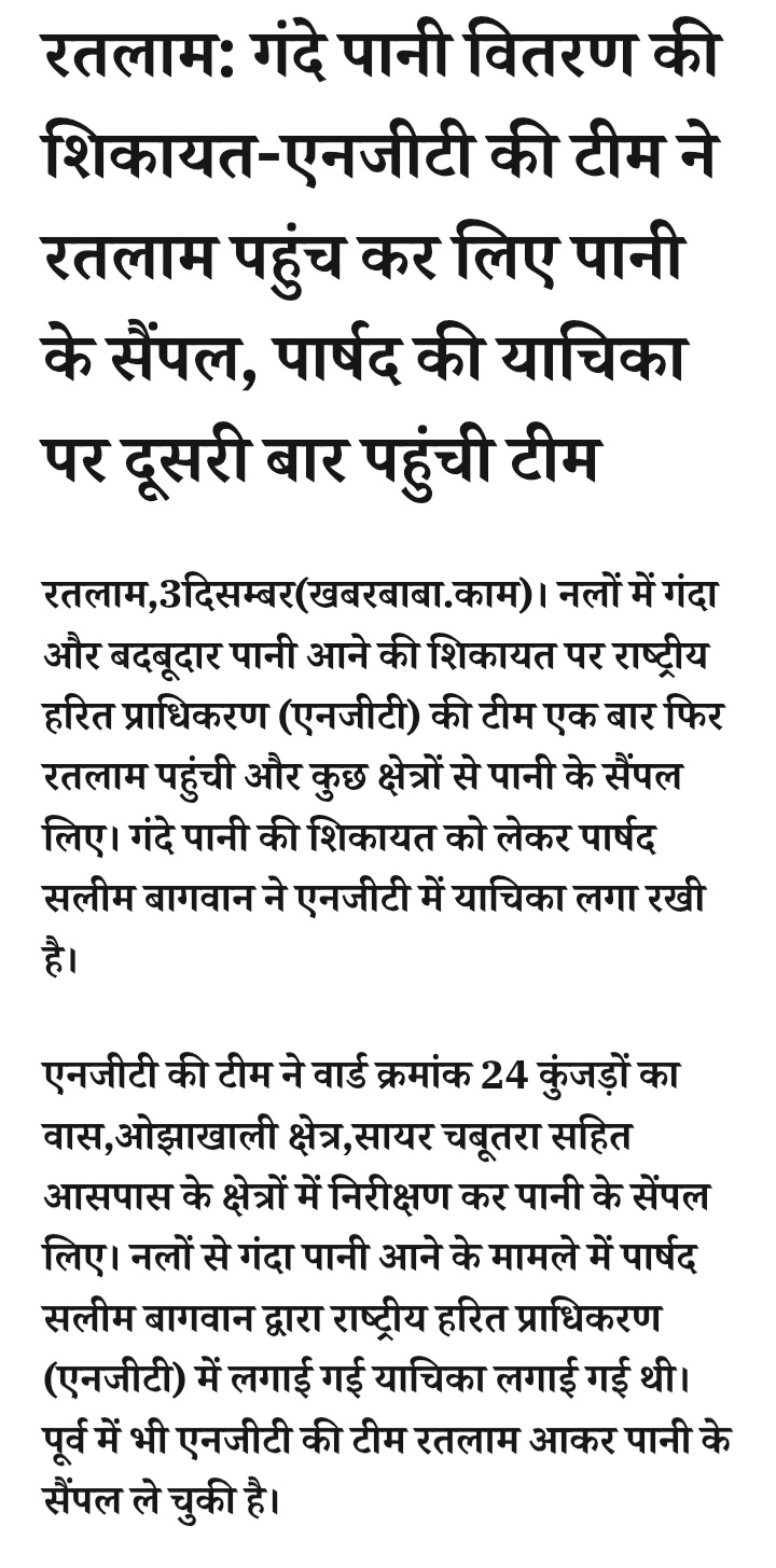 - रतलाम: गंदे पानी वितरण की शिकायत-एनजीटी की टीम ने रतलाम पहुंच कर लिए पानी के सैंपल, पार्षद की याचिका पर दूसरी बार पहुंची टीम