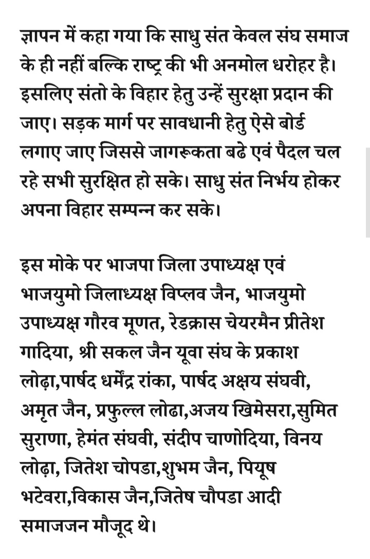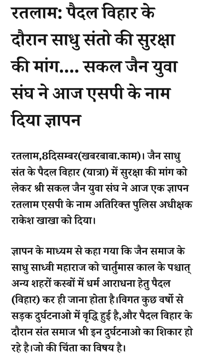- रतलाम: पैदल विहार के दौरान साधु संतो की सुरक्षा की मांग…. सकल जैन युवा संघ ने आज एसपी के नाम दिया ज्ञापन