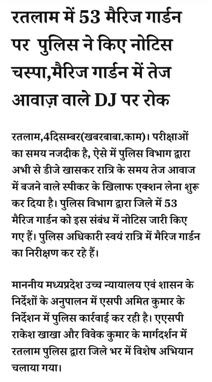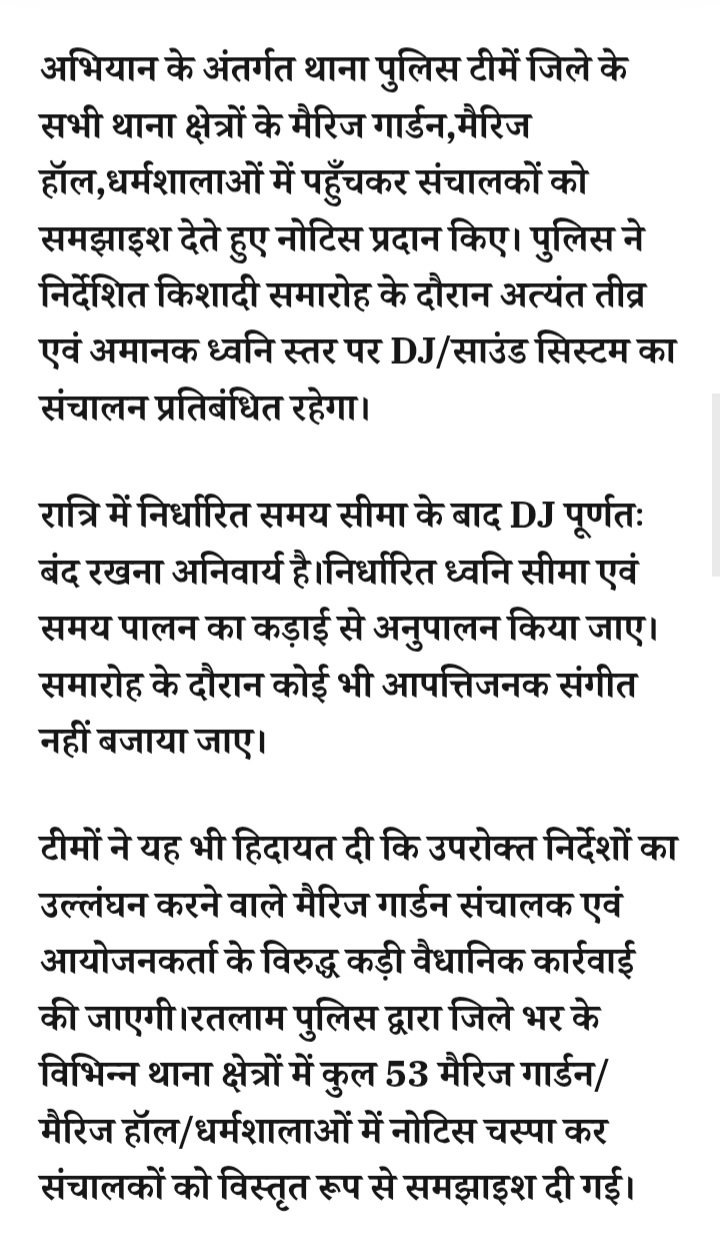 - रतलाम में 53 मैरिज गार्डन पर पुलिस ने किए नोटिस चस्पा,मैरिज गार्डन में तेज आवाज़ वाले DJ पर रोक