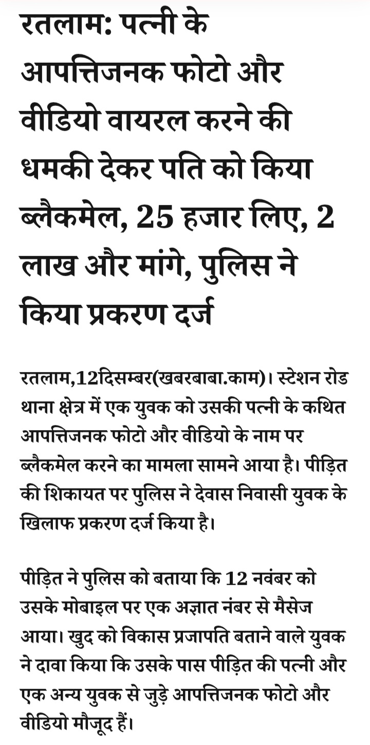 - रतलाम: पत्नी के आपत्तिजनक फोटो और वीडियो वायरल करने की धमकी देकर पति को किया ब्लैकमेल, 25 हजार लिए, 2 लाख और मांगे, पुलिस ने किया प्रकरण दर्ज