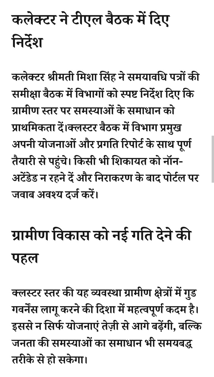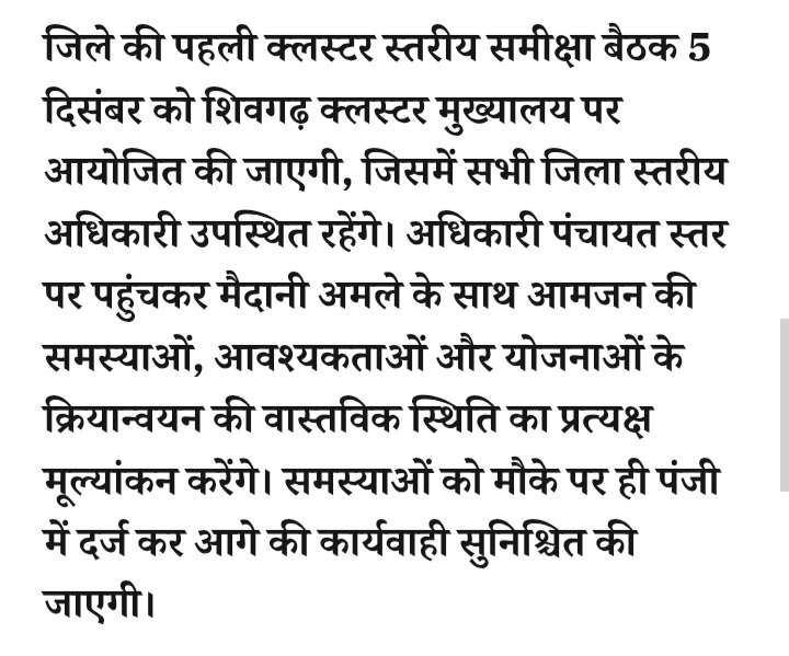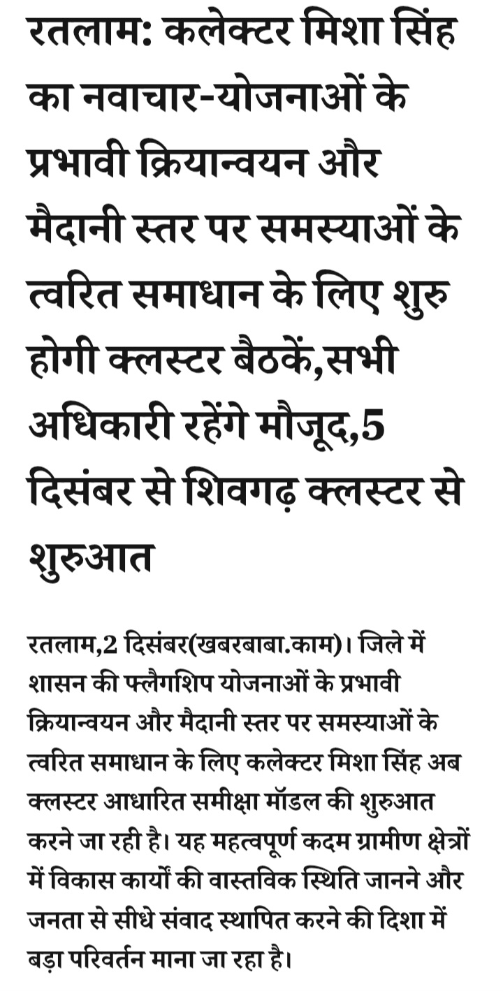 - रतलाम: कलेक्टर मिशा सिंह का नवाचार-योजनाओं के प्रभावी क्रियान्वयन और मैदानी स्तर पर समस्याओं के त्वरित समाधान के लिए शुरु होगी क्लस्टर बैठकें,सभी अधिकारी रहेंगे मौजूद,5 दिसंबर से शिवगढ़ क्लस्टर से शुरुआत