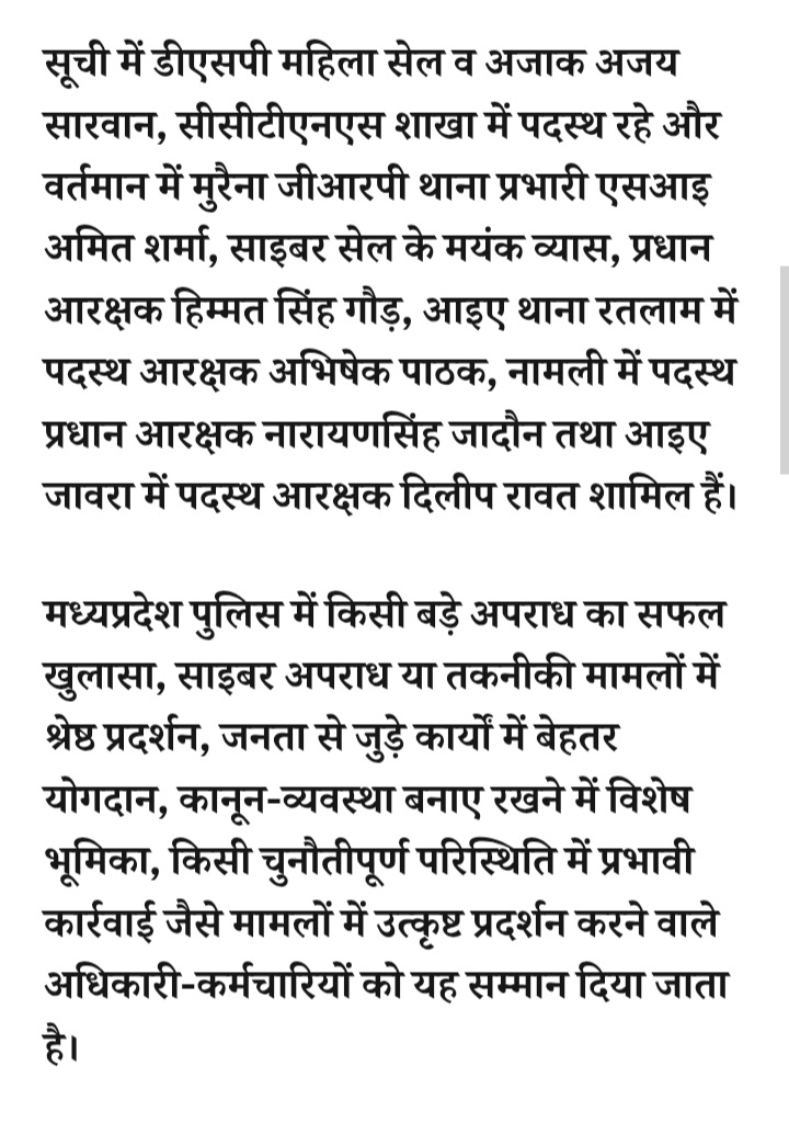 - रतलाम: डीएसपी अजय सारवान, साइबर सेल से मयंक व्यास सहित जिले के सात पुलिसकर्मियों को डीजी प्रशस्ति पत्र, डिस्क सम्मान,उत्कृष्ट सेवाओं के लिए दिया जाता है पुरुस्कार…