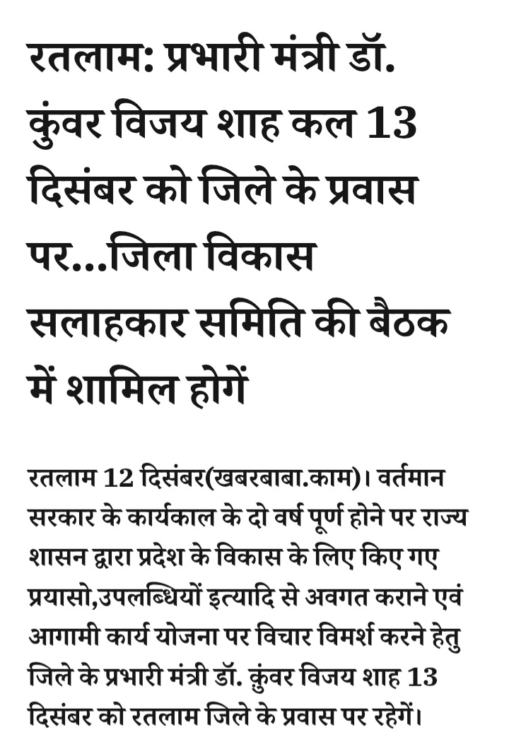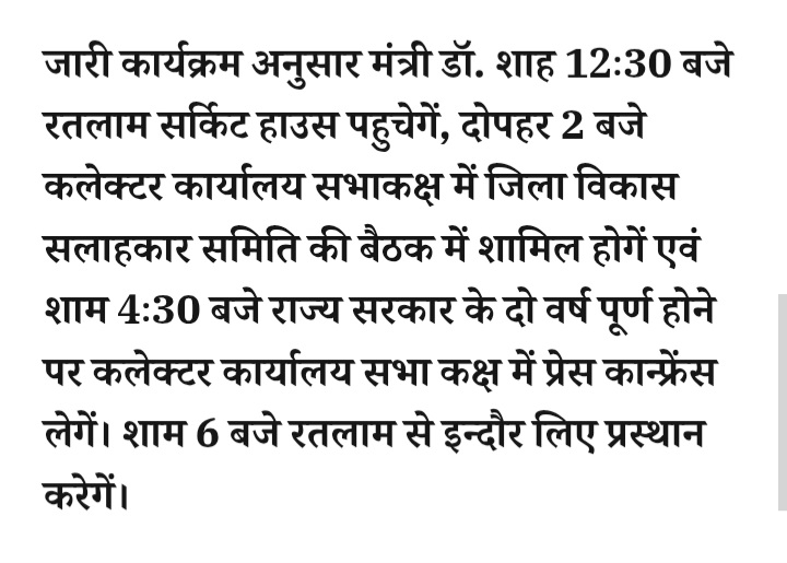 - रतलाम: प्रभारी मंत्री डॉ. कुंवर विजय शाह कल 13 दिसंबर को जिले के प्रवास पर…जिला विकास सलाहकार समिति की बैठक में शामिल होगें