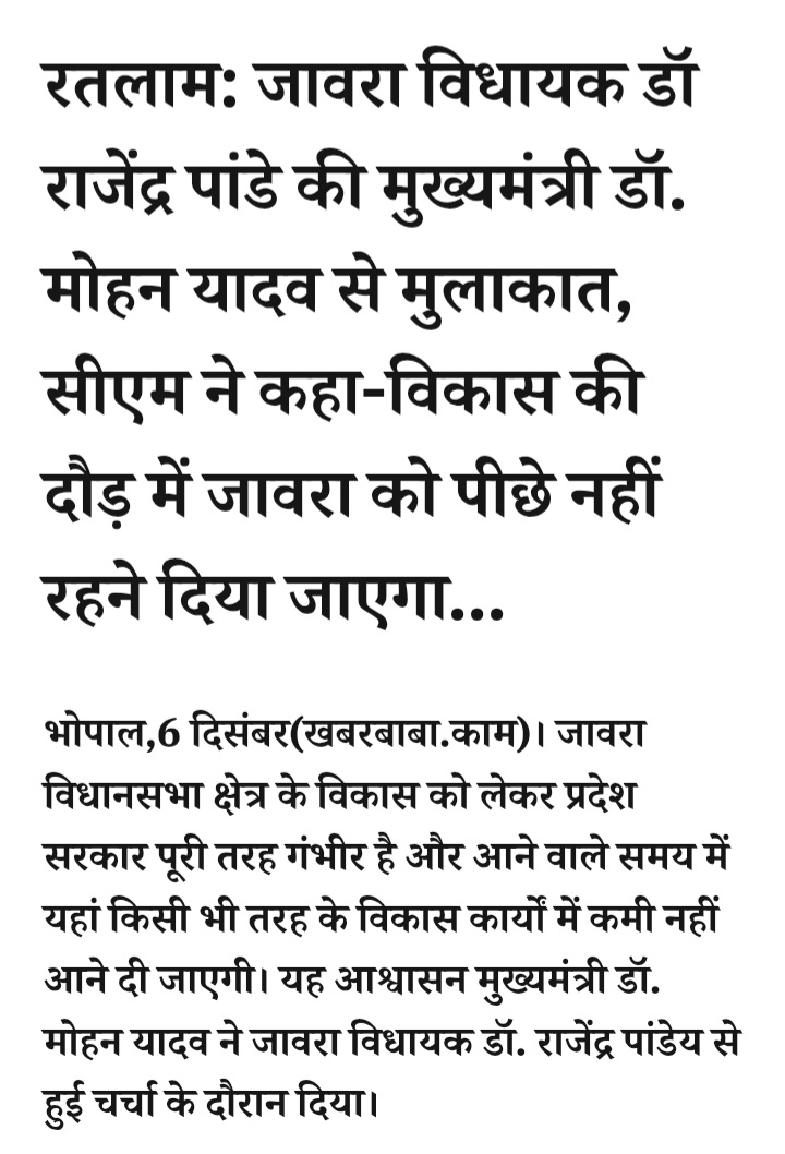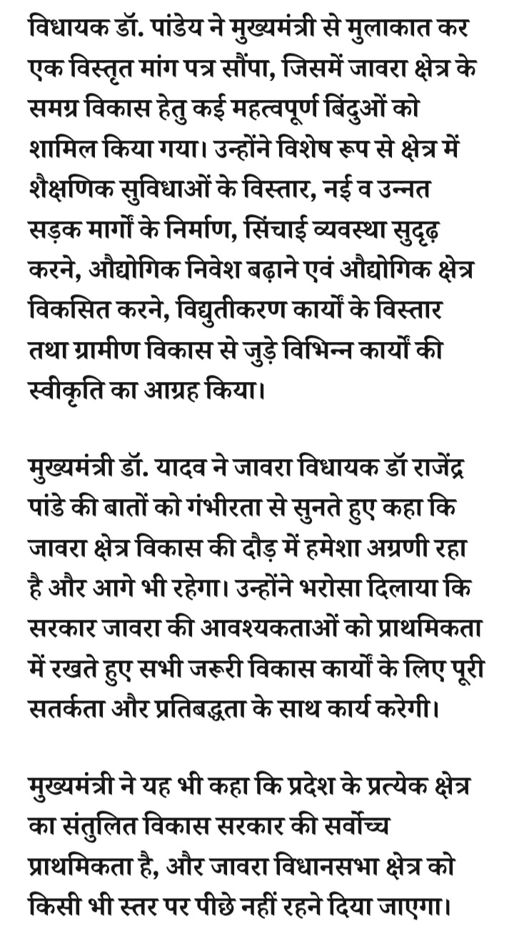 - रतलाम: जावरा विधायक डॉ राजेंद्र पांडे की मुख्यमंत्री डॉ. मोहन यादव से मुलाकात, सीएम ने कहा-विकास की दौड़ में जावरा को पीछे नहीं रहने दिया जाएगा…