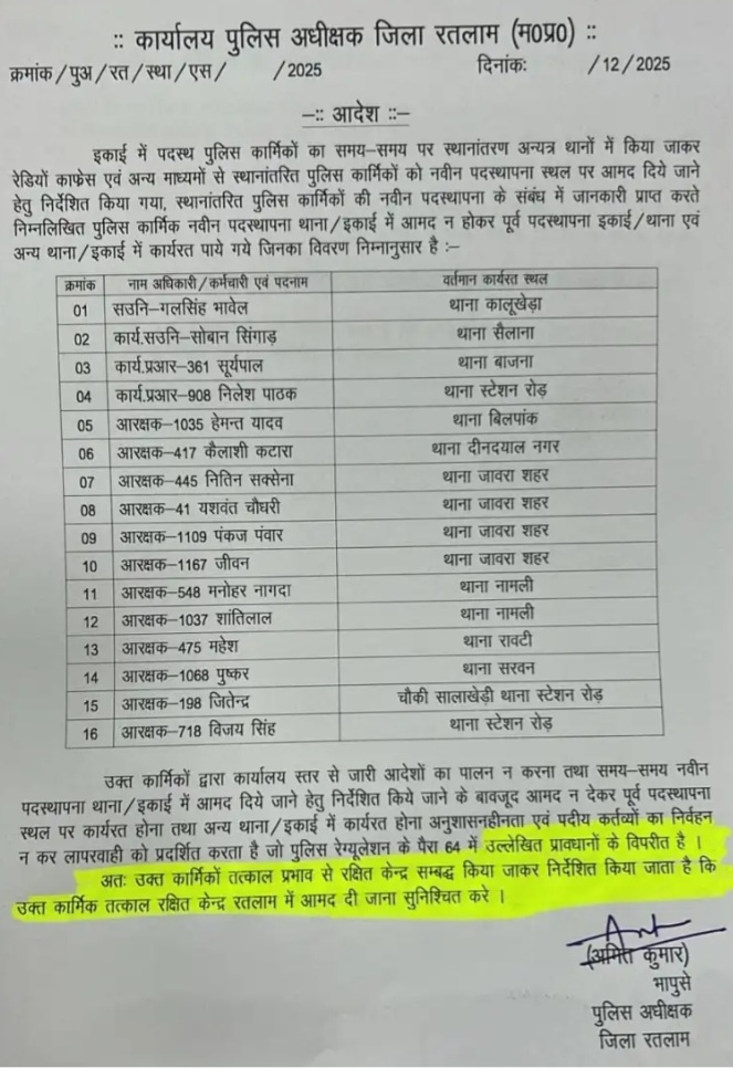 - रतलाम: एसपी अमित कुमार का सख्त एक्शन… 16 पुलिसकर्मी लाइन अटैच, महकमे में मचा हड़कंप… जानिए क्यों हुई यह कार्रवाई