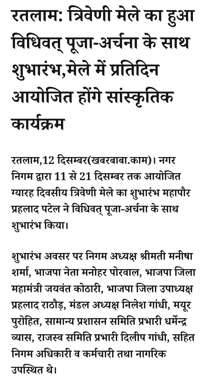 - रतलाम: त्रिवेणी मेले का हुआ विधिवत् पूजा-अर्चना के साथ शुभारंभ,मेले में प्रतिदिन आयोजित होंगे सांस्कृतिक कार्यक्रम