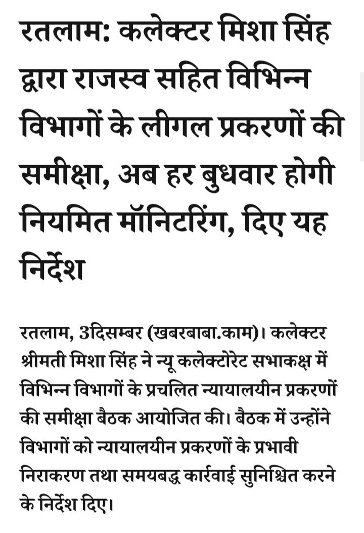 - रतलाम: कलेक्टर मिशा सिंह द्वारा राजस्व सहित विभिन्न विभागों के लीगल प्रकरणों की समीक्षा, अब हर बुधवार होगी नियमित मॉनिटरिंग, दिए यह निर्देश