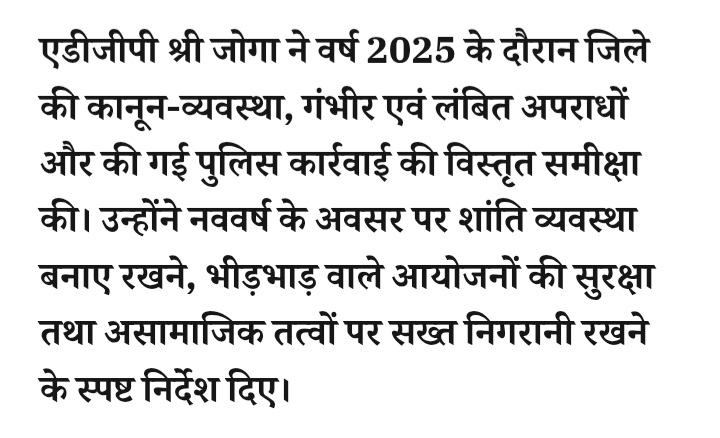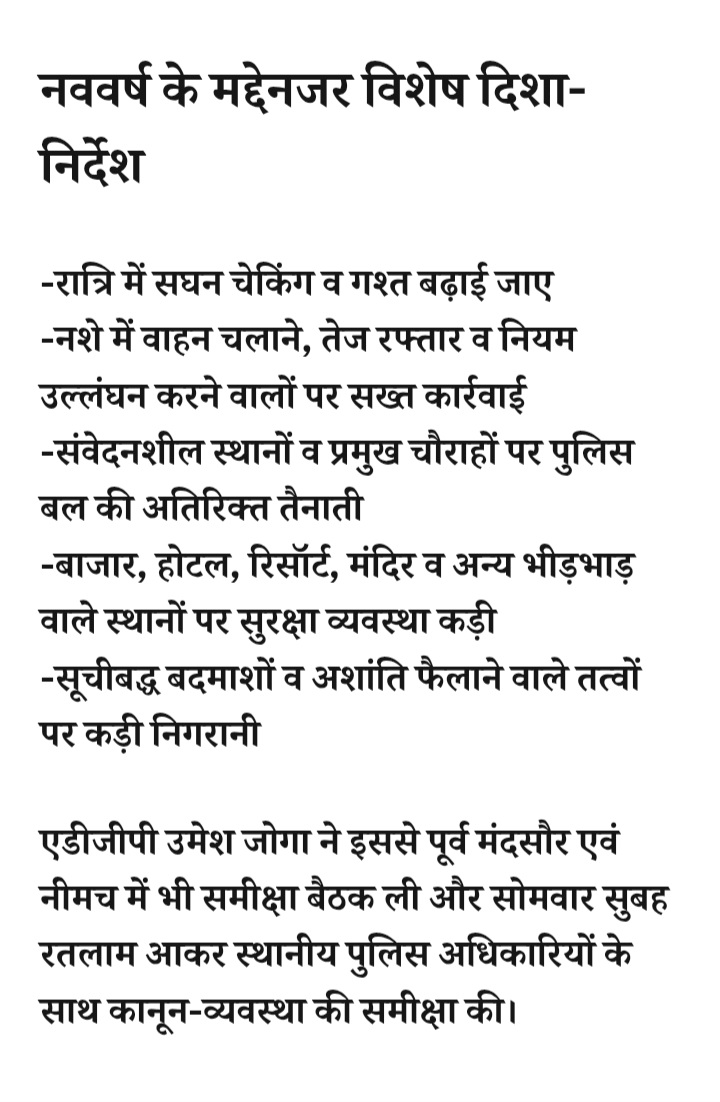 - रतलाम: नववर्ष को लेकर उज्जैन जोन एडीजीपी उमेश जोगा ने आज रतलाम में की समीक्षा बैठक, कानून-व्यवस्था सुदृढ़ रखने के निर्देश…मंदसौर और नीमच में भी बैठक ली