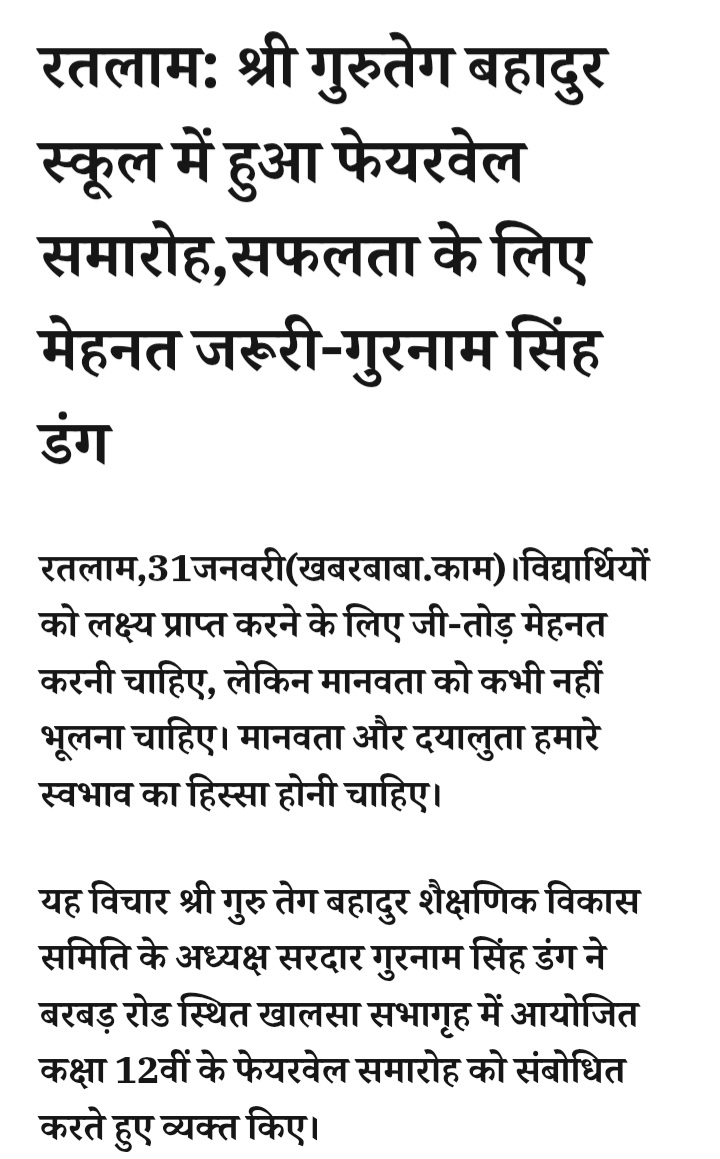 - रतलाम: श्री गुरुतेग बहादुर स्कूल में हुआ फेयरवेल समारोह,सफलता के लिए मेहनत जरूरी-गुरनाम सिंह डंग