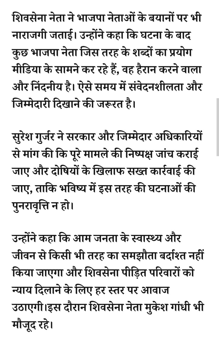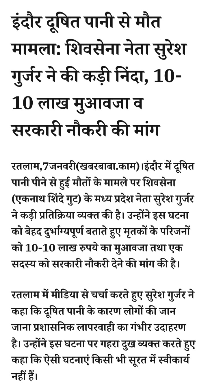 - इंदौर दूषित पानी से मौत मामला: शिवसेना नेता सुरेश गुर्जर ने की कड़ी निंदा, 10-10 लाख मुआवजा व सरकारी नौकरी की मांग