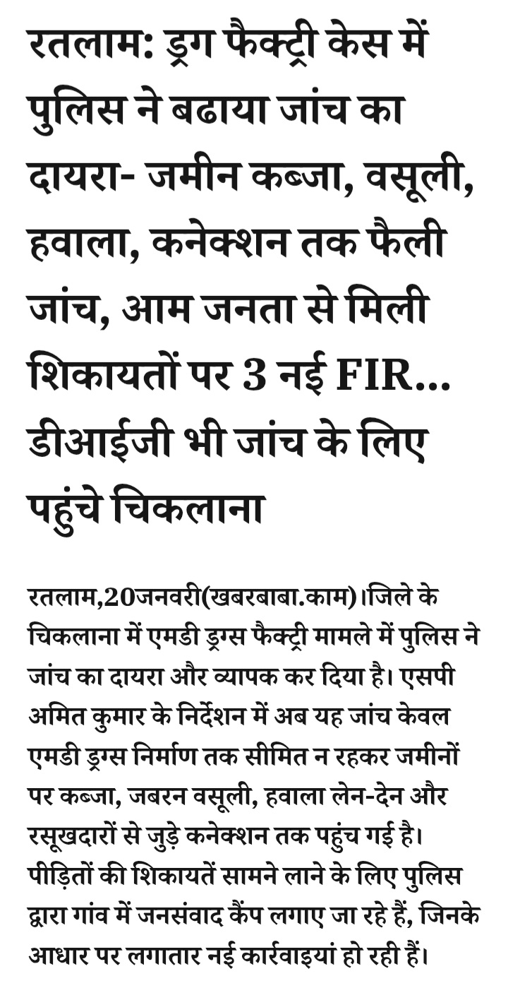 - रतलाम: ड्रग फैक्ट्री केस में पुलिस ने बढाया जांच का दायरा- जमीन कब्जा, वसूली, हवाला, कनेक्शन तक फैली जांच, आम जनता से मिली शिकायतों पर 3 नई FIR… डीआईजी भी जांच के लिए पहुंचे चिकलाना