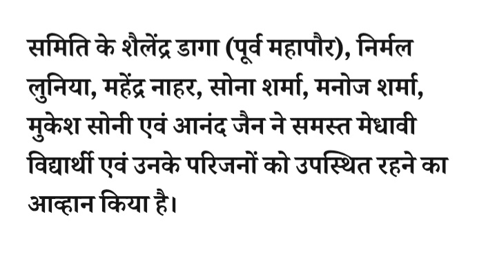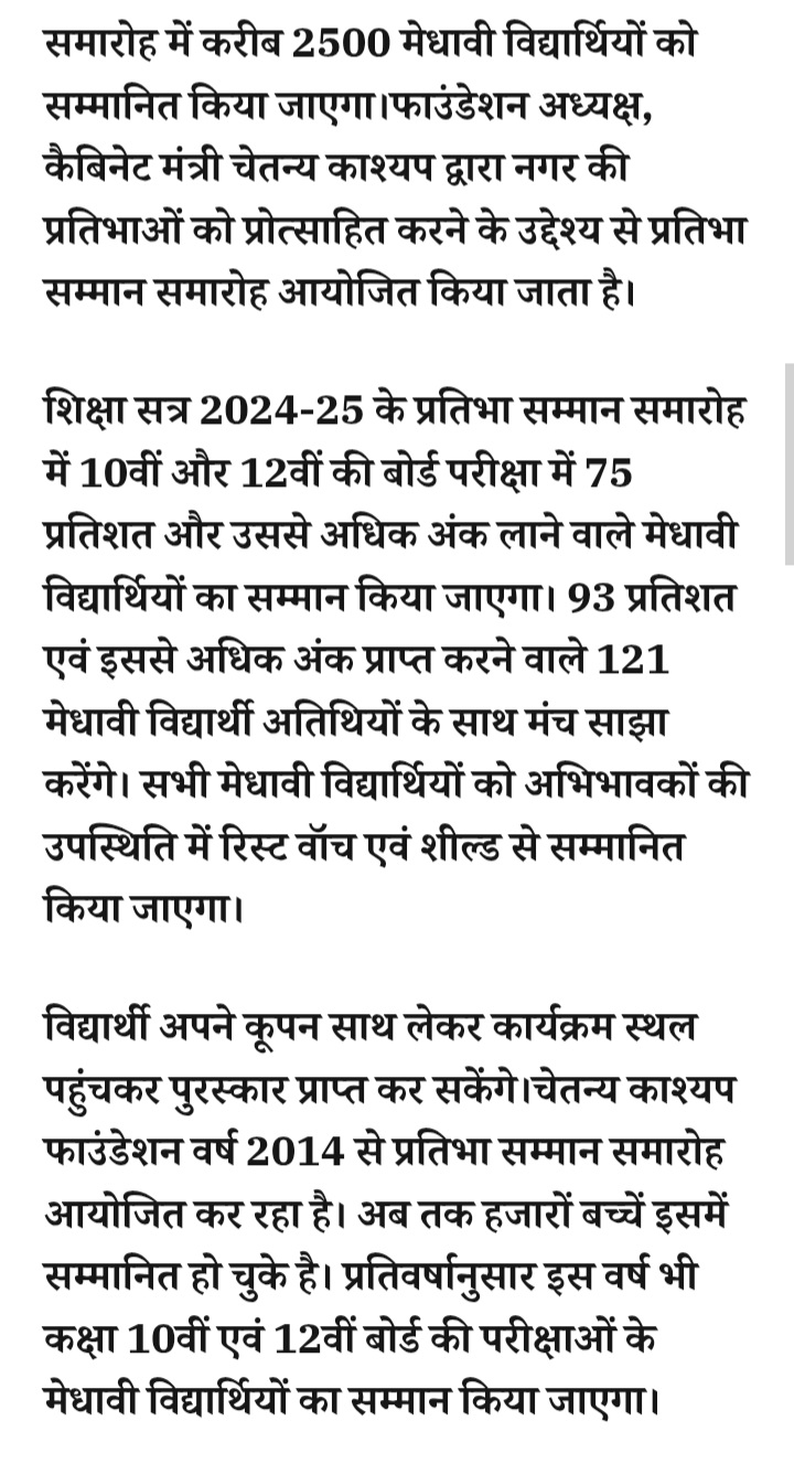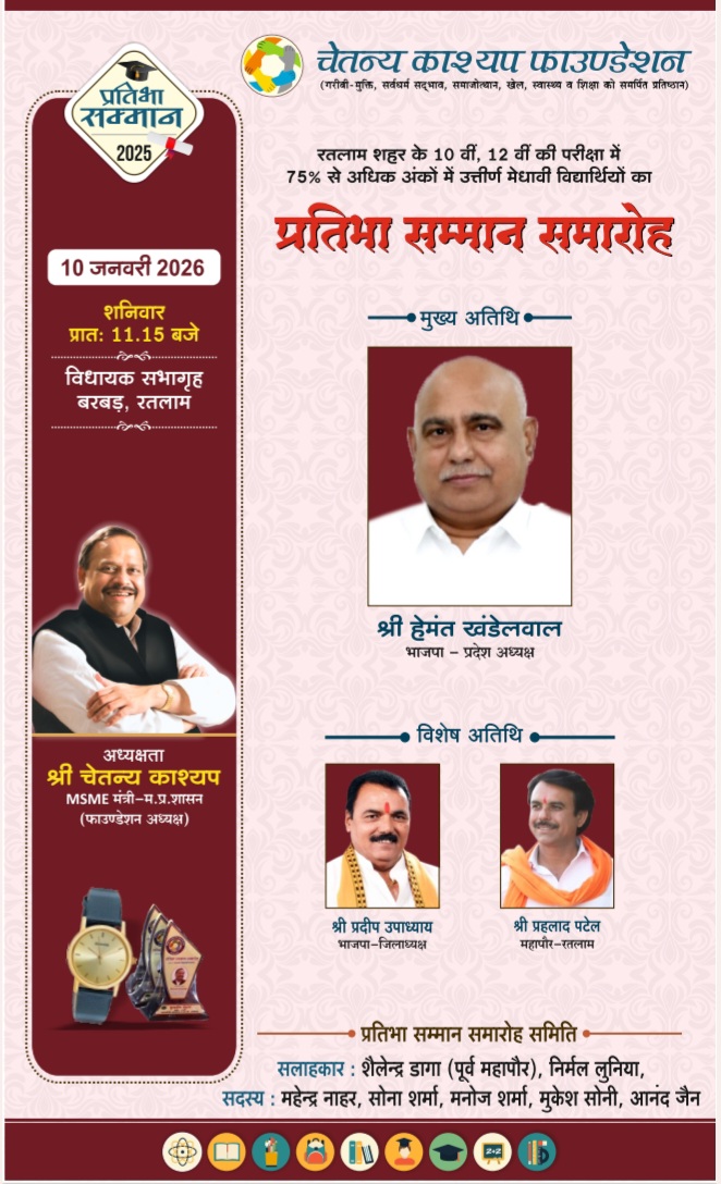 - प्रतिभा सम्मान समारोह-भाजपा प्रदेश अध्यक्ष हेमंत खंडेलवाल करेंगे मेधावी विद्यार्थियों को सम्मानित,चेतन्य काश्यप फाउंडेशन के आयोजन में 2500 मेधावी विद्यार्थियों का होगा सम्मान