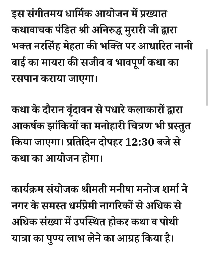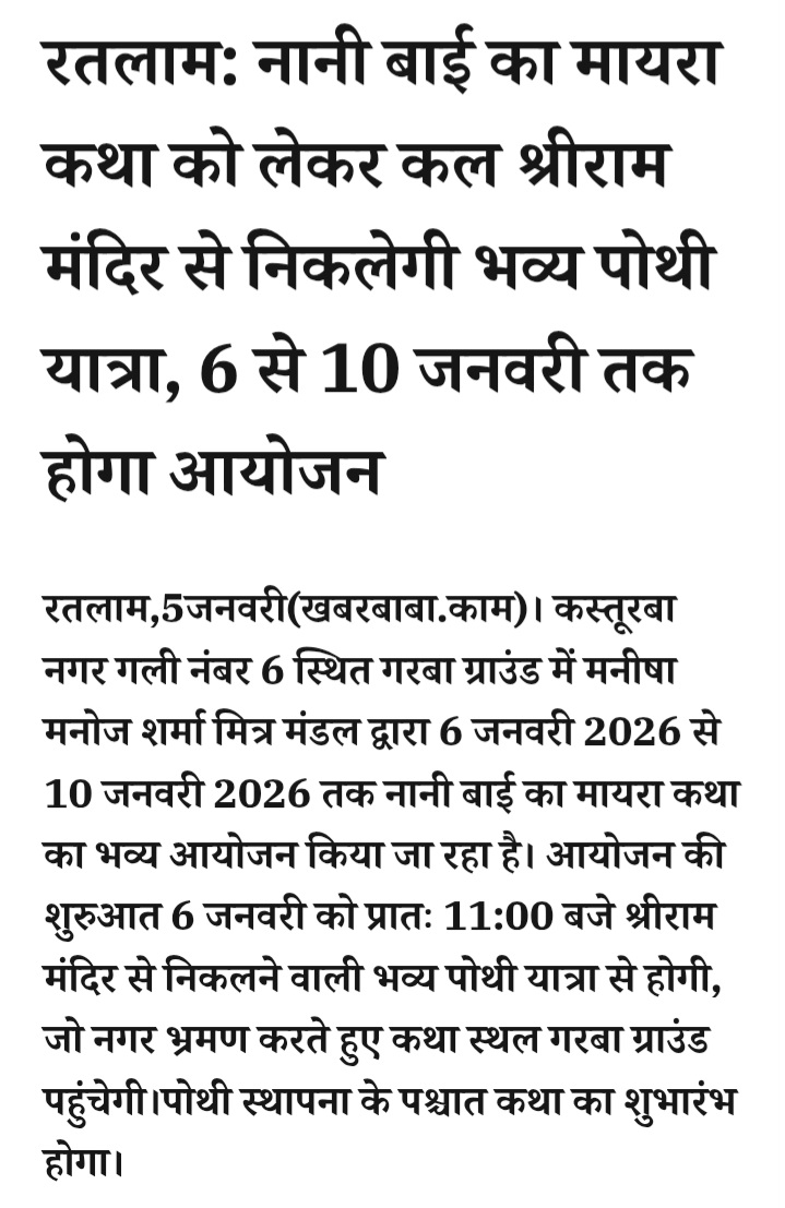 - रतलाम: नानी बाई का मायरा कथा को लेकर कल श्रीराम मंदिर से निकलेगी भव्य पोथी यात्रा, 6 से 10 जनवरी तक होगा आयोजन