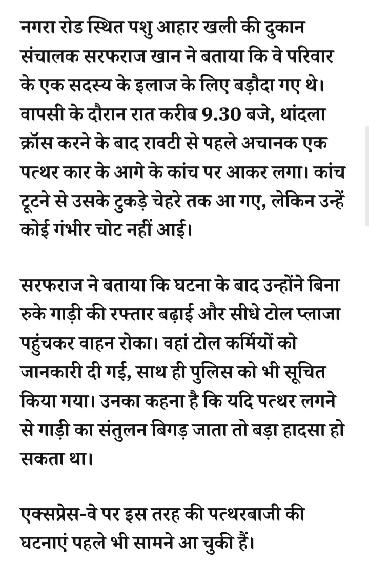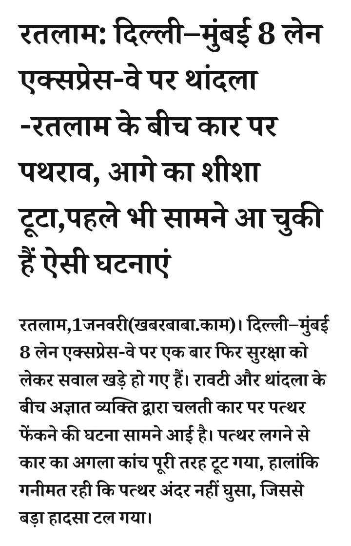 - रतलाम: दिल्ली–मुंबई 8 लेन एक्सप्रेस-वे पर थांदला -रतलाम के बीच कार पर पथराव, आगे का शीशा टूटा,पहले भी सामने आ चुकी हैं ऐसी घटनाएं