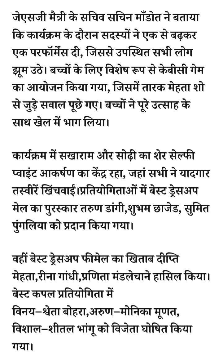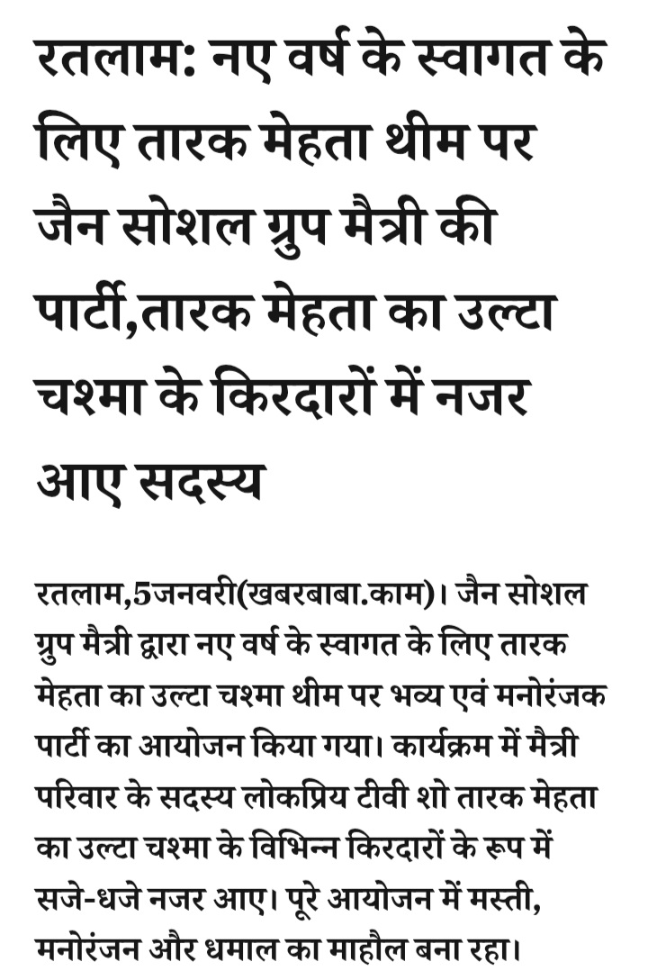 - रतलाम: नए वर्ष के स्वागत के लिए तारक मेहता थीम पर जैन सोशल ग्रुप मैत्री की पार्टी,तारक मेहता का उल्टा चश्मा के किरदारों में नजर आए सदस्य