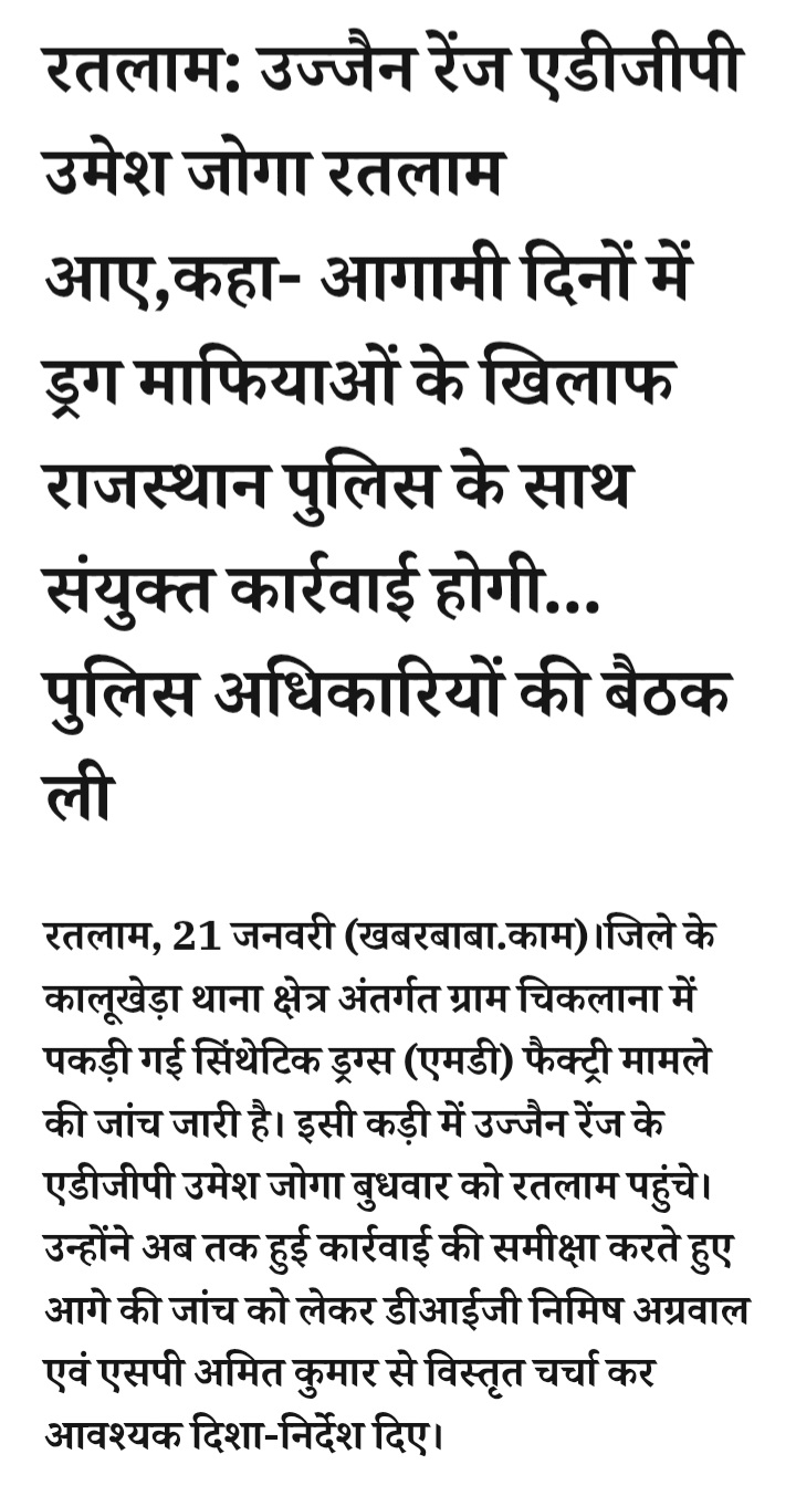 - रतलाम: उज्जैन रेंज एडीजीपी उमेश जोगा रतलाम आए,कहा- आगामी दिनों में ड्रग माफियाओं के खिलाफ राजस्थान पुलिस के साथ संयुक्त कार्रवाई होगी… पुलिस अधिकारियों की बैठक ली