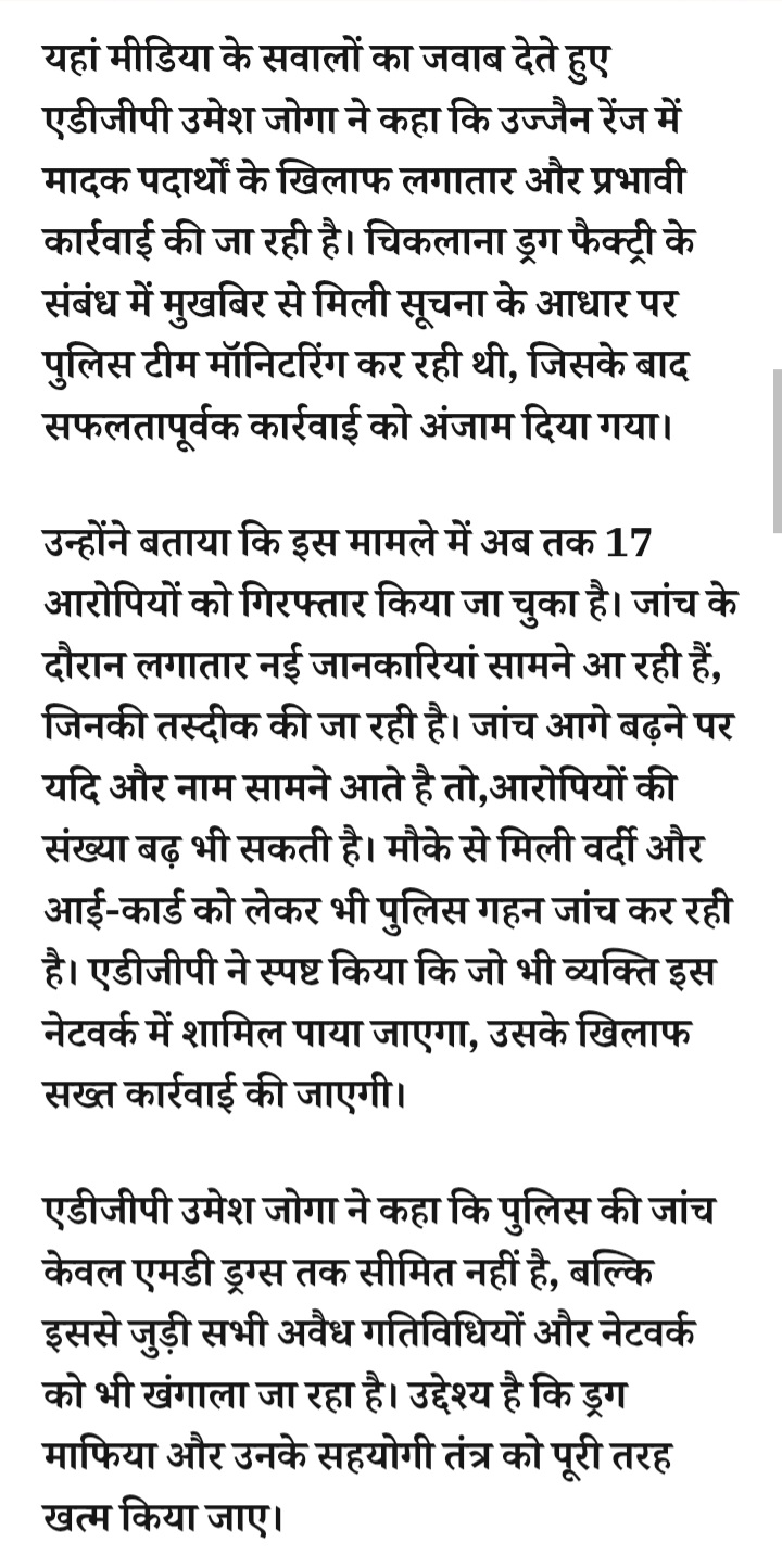 - रतलाम: ड्रग फैक्ट्री केस में पुलिस ने बढाया जांच का दायरा- जमीन कब्जा, वसूली, हवाला, कनेक्शन तक फैली जांच, आम जनता से मिली शिकायतों पर 3 नई FIR… डीआईजी भी जांच के लिए पहुंचे चिकलाना