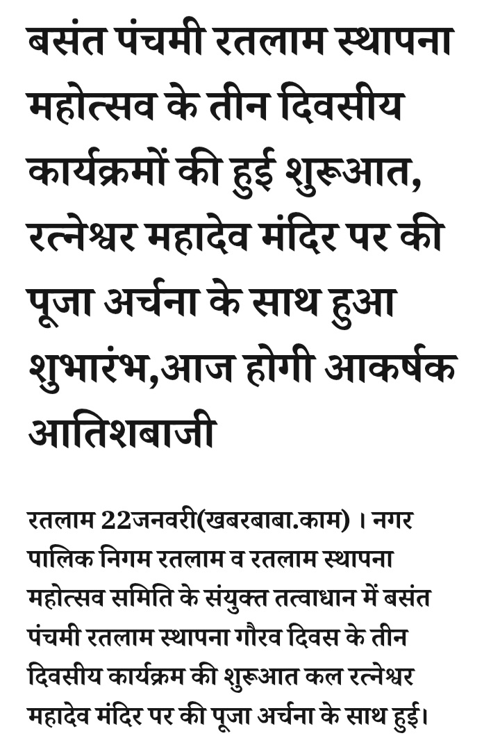 - बसंत पंचमी रतलाम स्थापना महोत्सव के तीन दिवसीय कार्यक्रमों की हुई शुरूआत, रत्नेश्वर महादेव मंदिर पर की पूजा अर्चना के साथ हुआ शुभारंभ,आज होगी आकर्षक आतिशबाजी