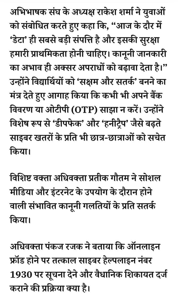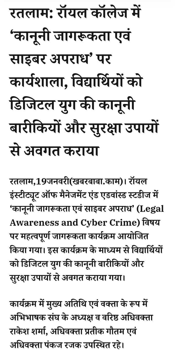 - रतलाम: रॉयल कॉलेज में ‘कानूनी जागरूकता एवं साइबर अपराध’ पर कार्यशाला, विद्यार्थियों को डिजिटल युग की कानूनी बारीकियों और सुरक्षा उपायों से अवगत कराया
