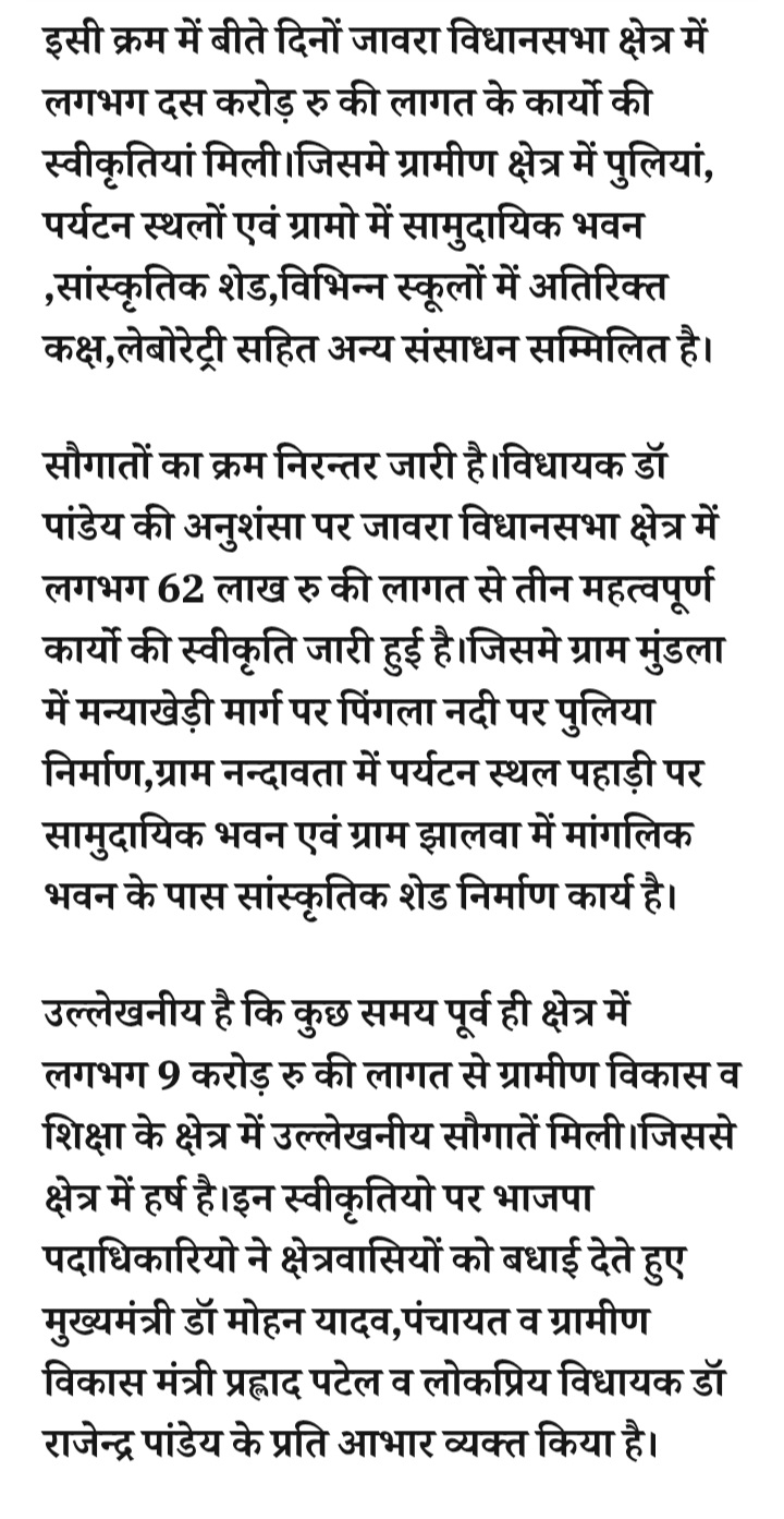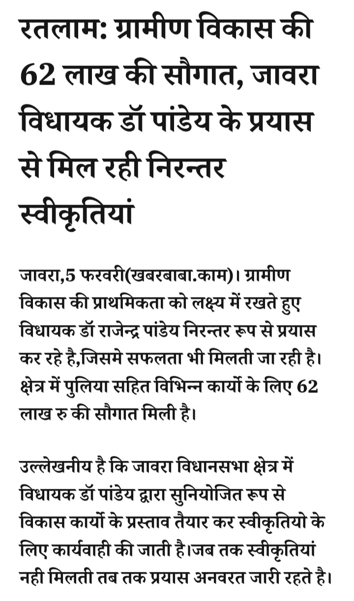- रतलाम: ग्रामीण विकास की 62 लाख की सौगात, जावरा विधायक डॉ पांडेय के प्रयास से मिल रही निरन्तर स्वीकृतियां