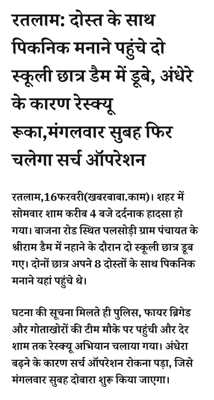 रतलाम: दोस्त के साथ पिकनिक मनाने पहुंचे दो स्कूली छात्र डैम में डूबे, अंधेरे के कारण रेस्क्यू रूका,मंगलवार सुबह फिर चलेगा सर्च ऑपरेशनFebruary 16, 2026