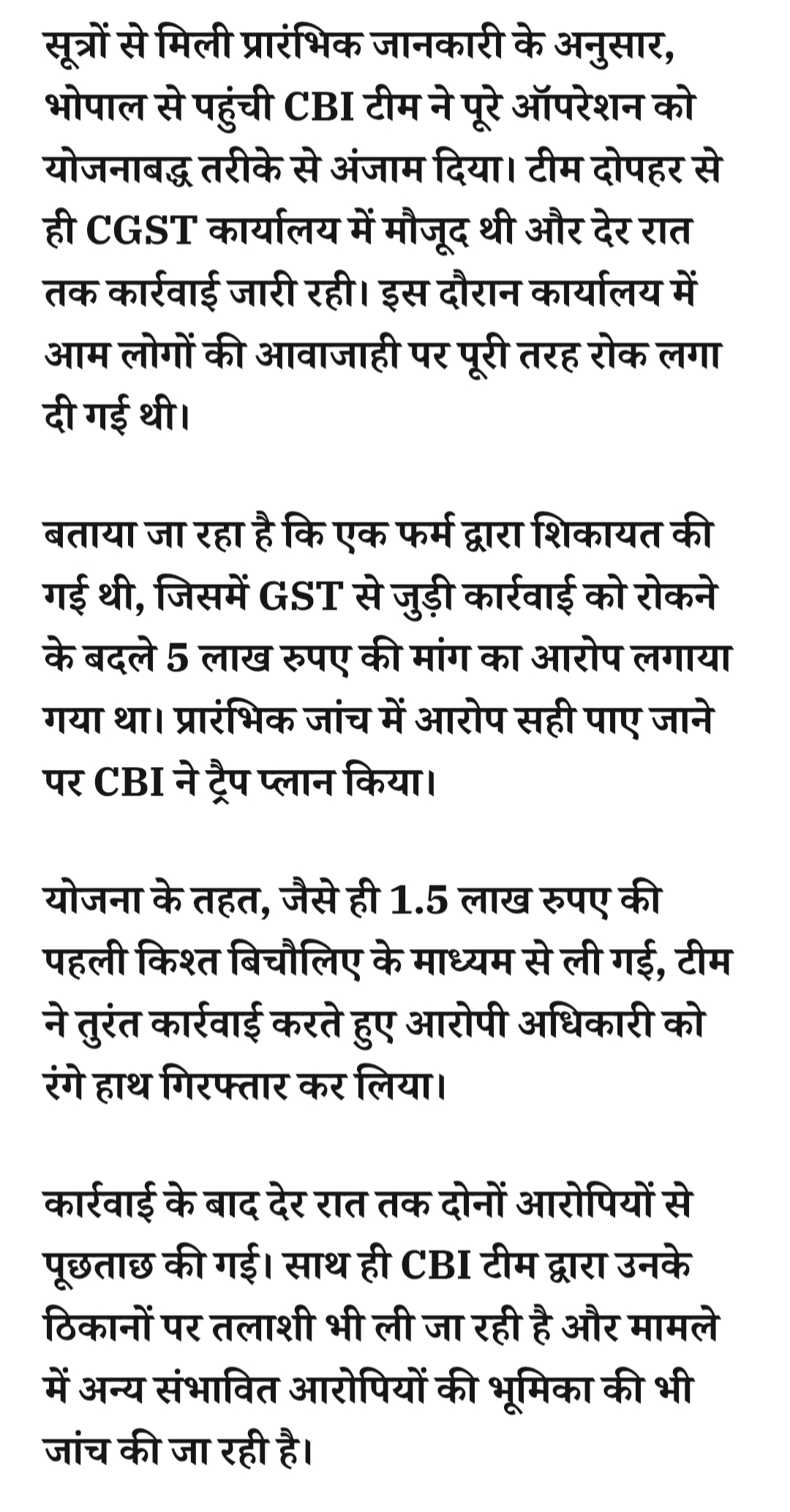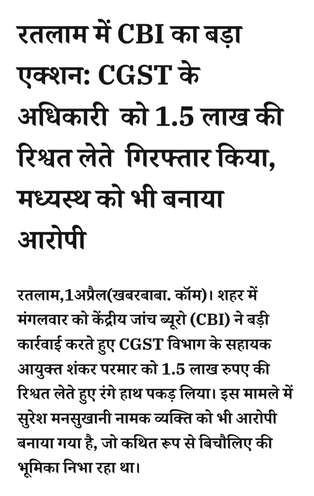 रतलाम में CBI का बड़ा एक्शन: CGST के अधिकारी को 1.5 लाख की रिश्वत लेते गिरफ्तार किया, मध्यस्थ को भी बनाया आरोपीMarch 31, 2026