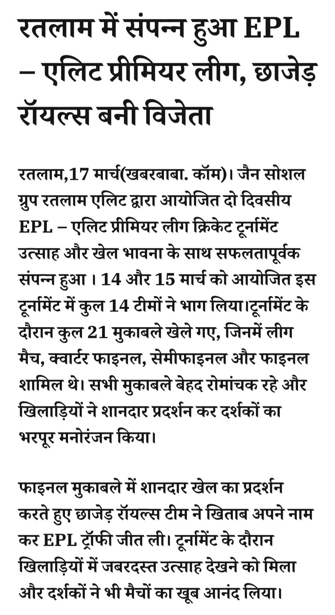 • रतलाम में संपन्न हुआ EPL – एलिट प्रीमियर लीग, छाजेड़ रॉयल्स बनी विजेता