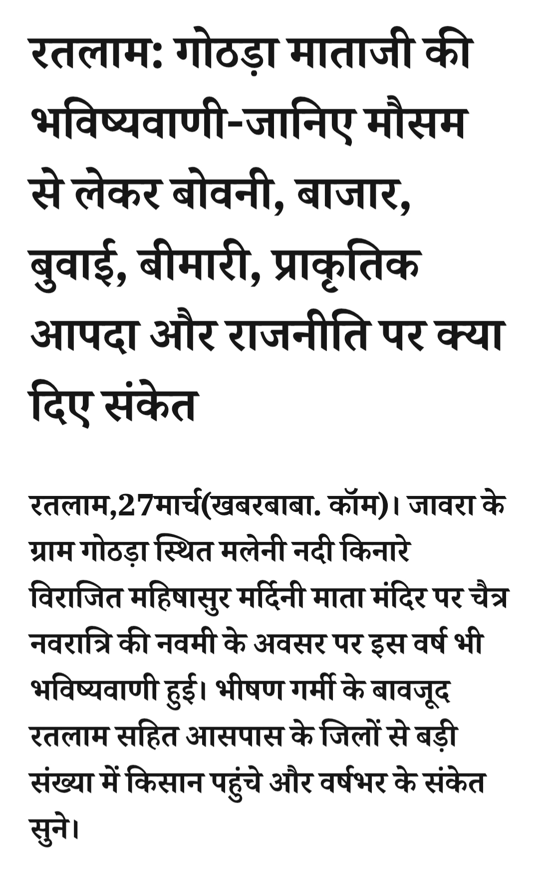 रतलाम: गोठड़ा माताजी की भविष्यवाणी-जानिए मौसम से लेकर बोवनी, बाजार, बुवाई, बीमारी, प्राकृतिक आपदा और राजनीति पर क्या दिए संकेतMarch 27, 2026