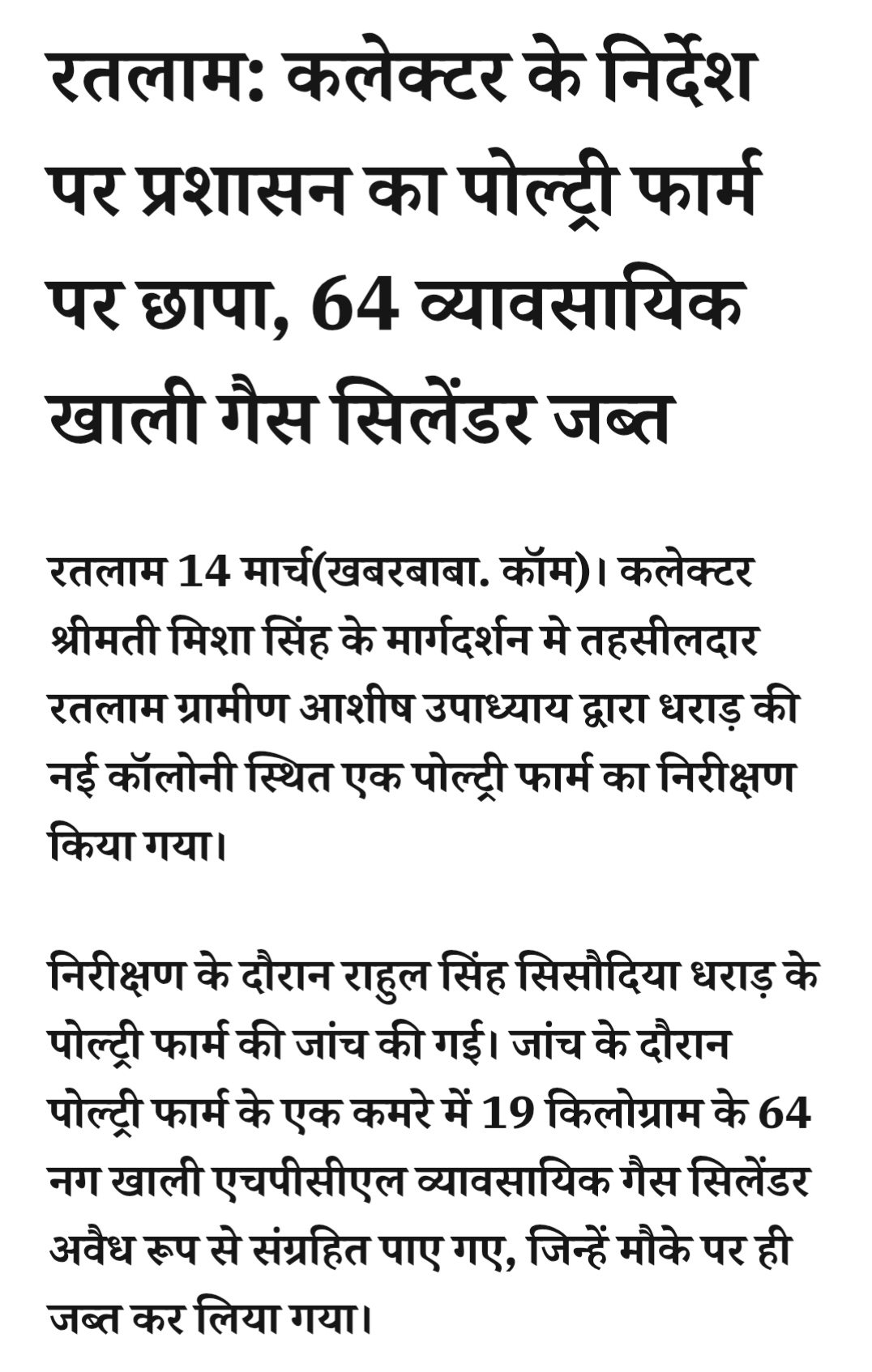 रतलाम: कलेक्टर के निर्देश पर प्रशासन का पोल्ट्री फार्म पर छापा, 64 व्यावसायिक खाली गैस सिलेंडर जब्तMarch 14, 2026