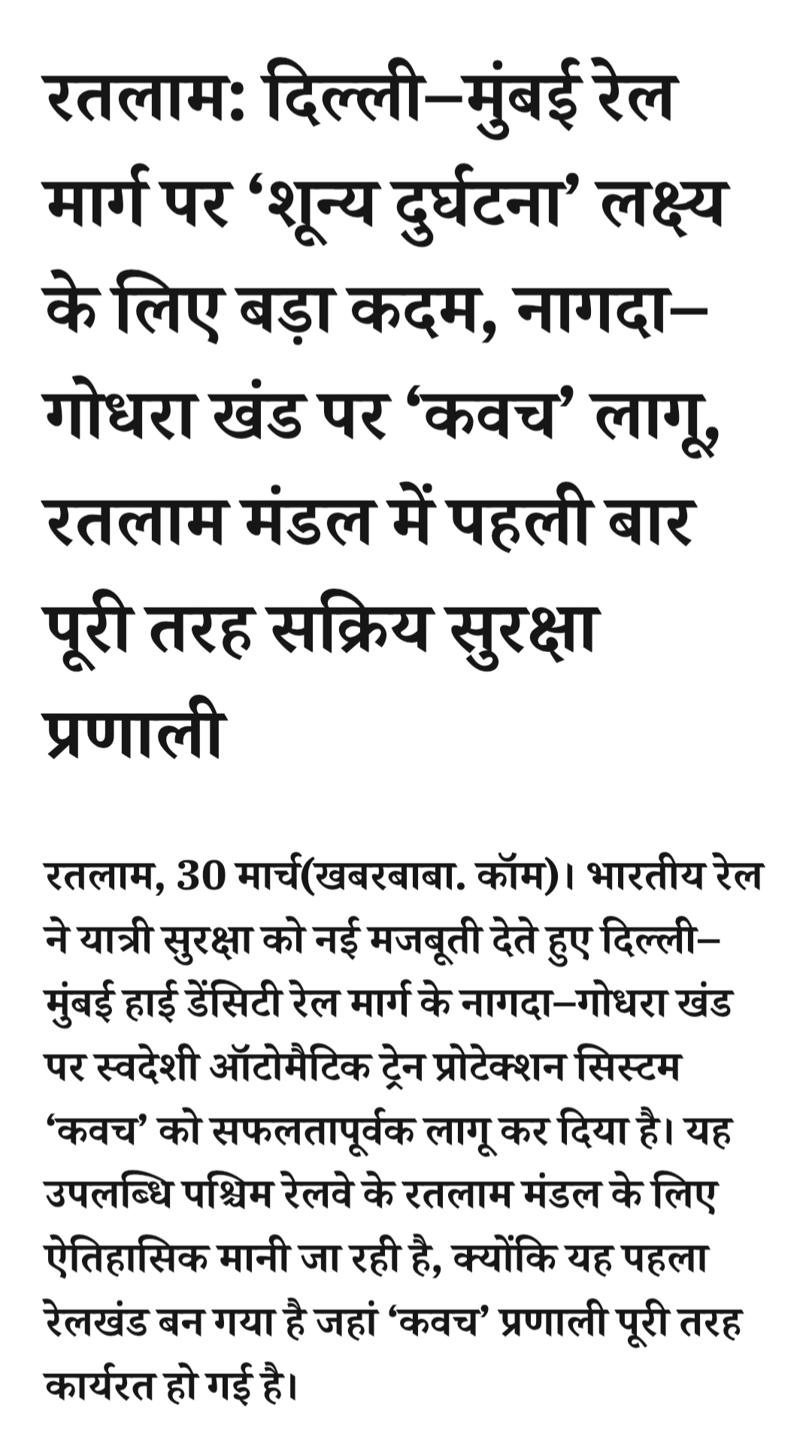रतलाम: दिल्ली–मुंबई रेल मार्ग पर ‘शून्य दुर्घटना’ लक्ष्य के लिए बड़ा कदम, नागदा–गोधरा खंड पर ‘कवच’ लागू, रतलाम मंडल में पहली बार पूरी तरह सक्रिय सुरक्षा प्रणालीMarch 30, 2026