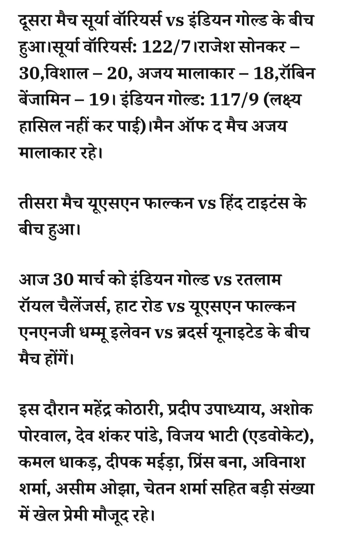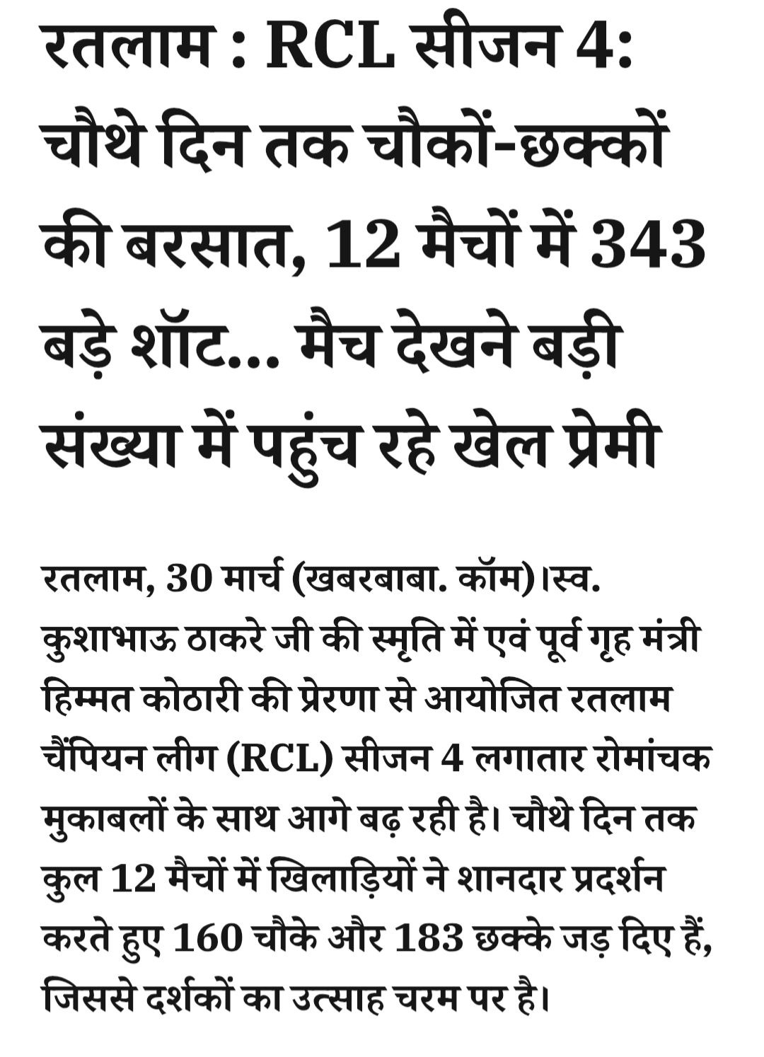 रतलाम : RCL सीजन 4: चौथे दिन तक चौकों-छक्कों की बरसात, 12 मैचों में 343 बड़े शॉट… मैच देखने बड़ी संख्या में पहुंच रहे खेल प्रेमीMarch 30, 2026